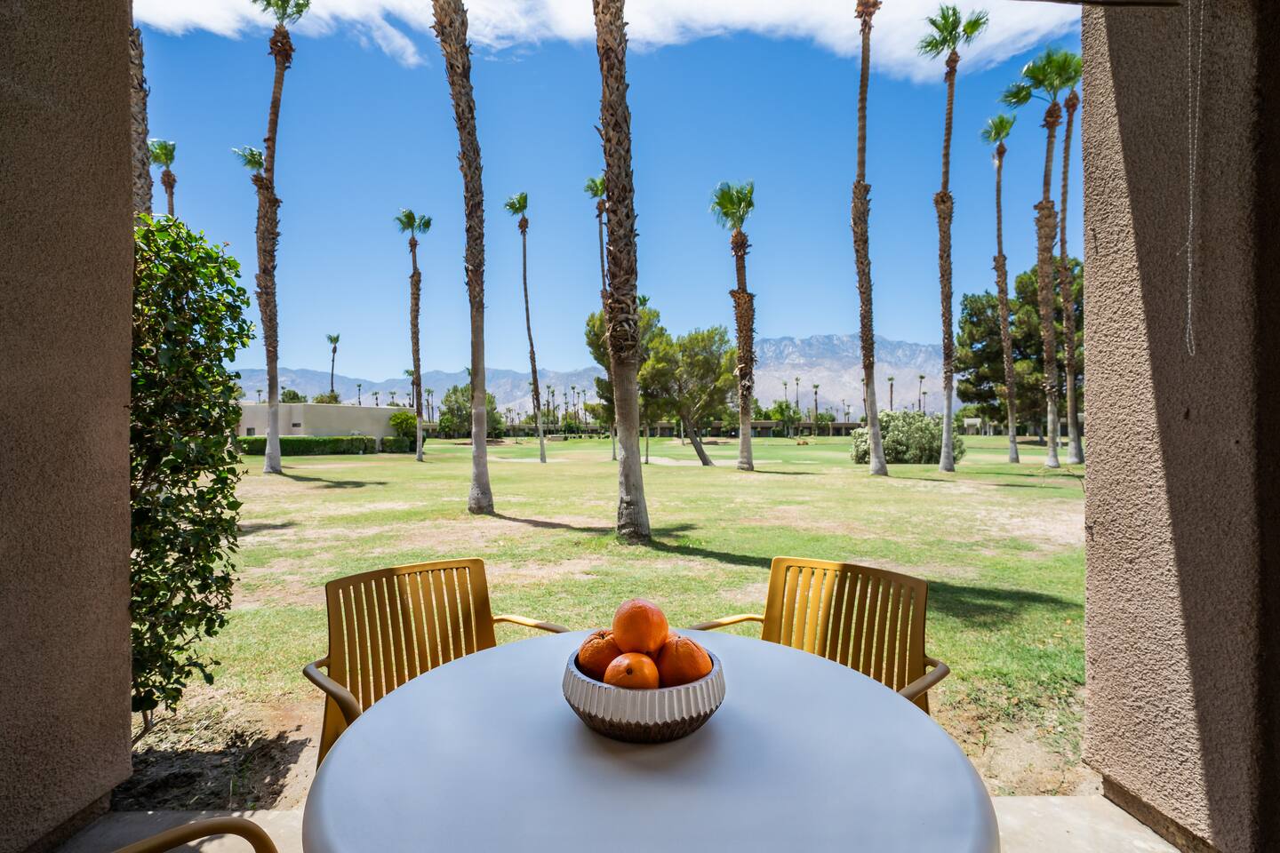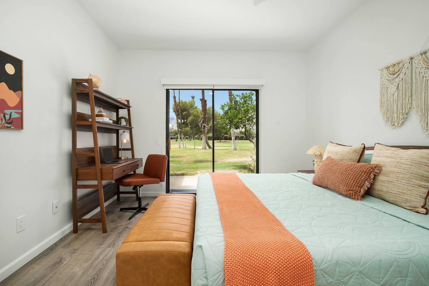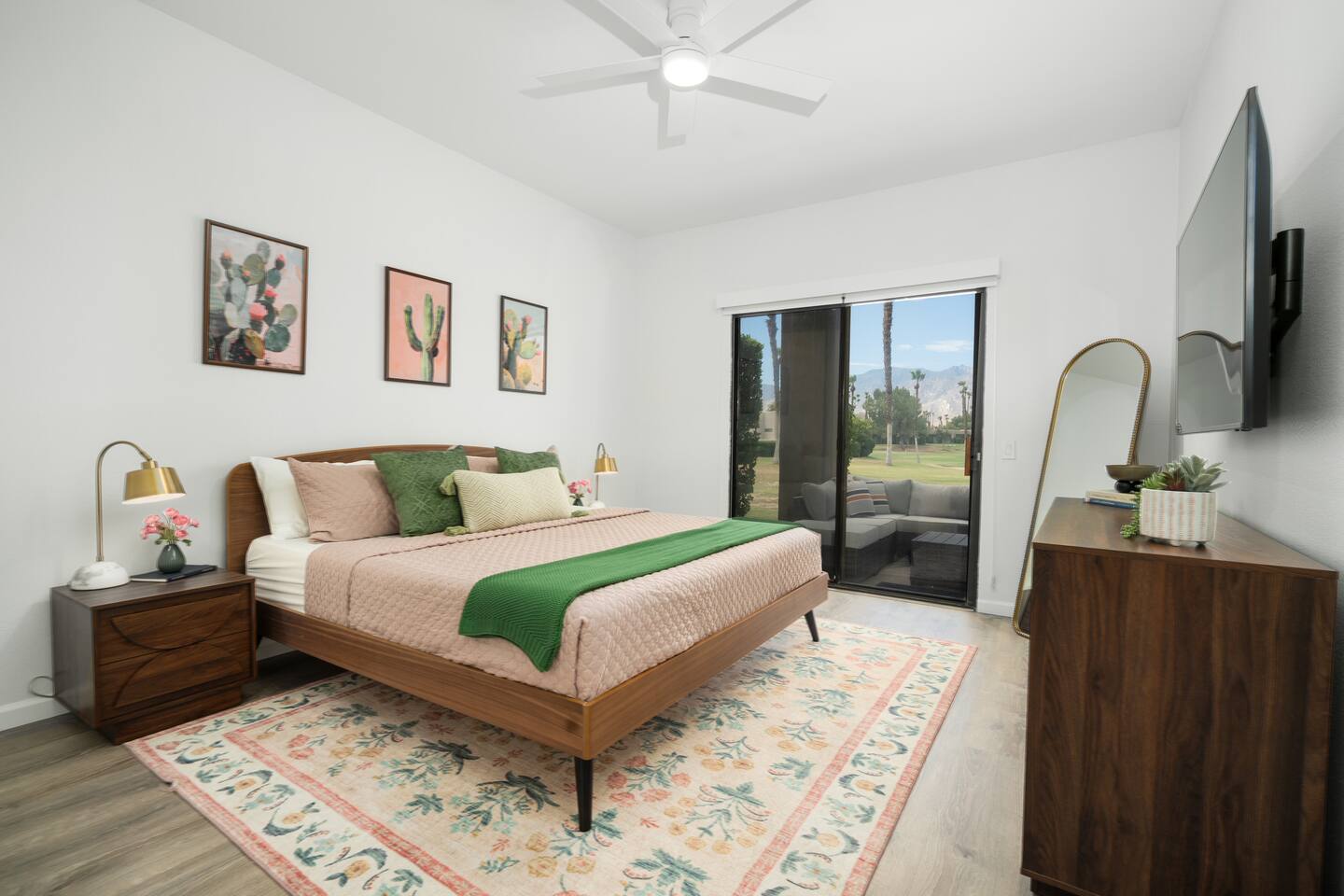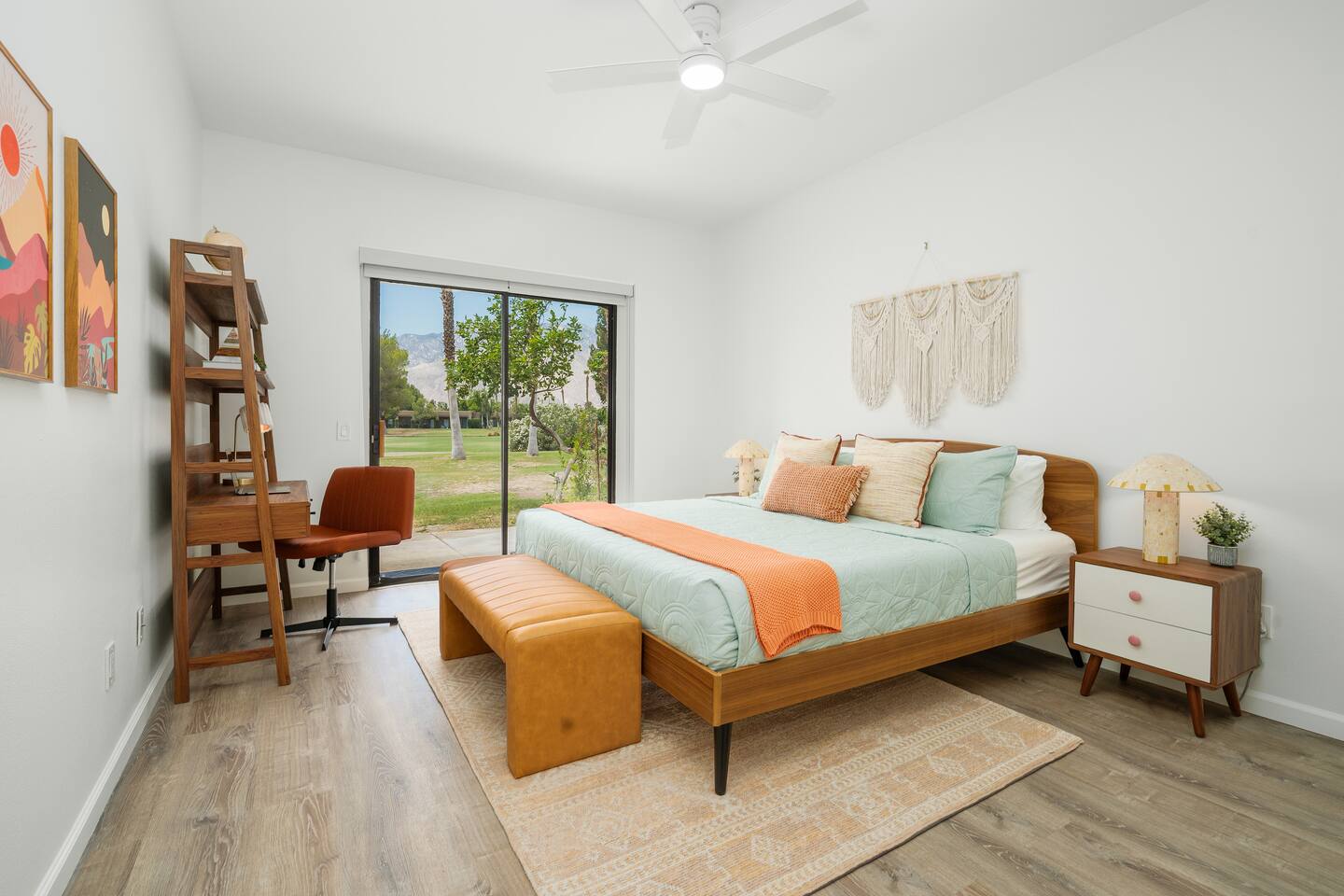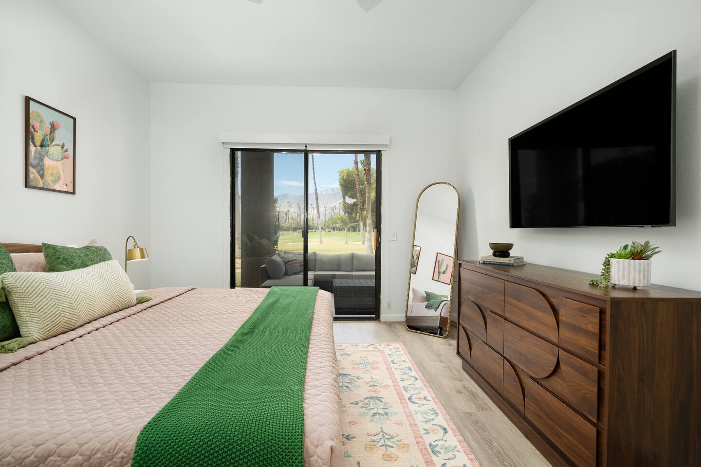 --- INTERIOR DETAILS --- This condo accommodates up to 4 guests with 2 dual primary bedrooms & 2 full ensuite bath\Additional spaces include a fully stocked kitchen, dining space, living room, garage and laundry space. BEDROOMS: ●Bedroom #1 in pictures: King bed with ensuite bath, nightstands, table lamps, dresser, smart tv, walk-in closet, luggage rack, ceiling fan, private access sliding door to the back patio. ●Bedroom #2 in pictures :King bed with ensuite bath, nightstands, table lamps, working desk, closet, luggage rack, ceiling fan, private access sliding door to back patio. ●Bathroom #1: Standing shower, dual vanity, hairdryer, makeup towels ●Bathroom #2: Standing shower, dual vanity, makeup towels --- EXTERIOR DETAILS --- ●Pool & Spa: Community pool and & Spa are a short 2 minute walk when you exit left from the front of the property ●Patio: Lounge seating, outdoor dining for 4, Gas BBQ ●Private Garage with access for 1 vehicle, garage remote provided ---LOCATION--- The condo is located on Isleta Ct which is the best street in the Desert Princess community. It’s a private dead end street away from the busy roads and close to community amenities. Guests are approximately one block from the newly renovated gym, spa, tennis centre, pickleball courts, full size driving range, renovated clubhouse and EV charger parking spots. Guests get a discount at the award winning golf course. (Rated among the best in the valley by golf digest). Tennis, pickle ball and golf clinics available. ---COMMUNITY--- Desert Princess country club and resort is a gated community built around a 27 hole Championship PGA golf course. The Resort boasts 34 community pools and is Ideally located just 10 minutes to the airport and 15 minutes to downtown Palm Springs.