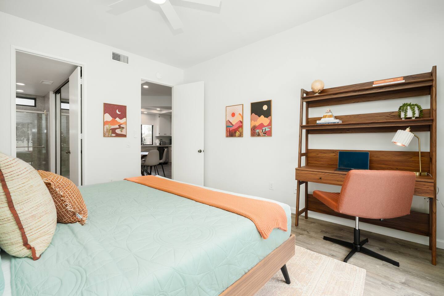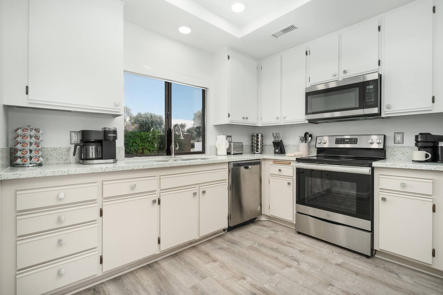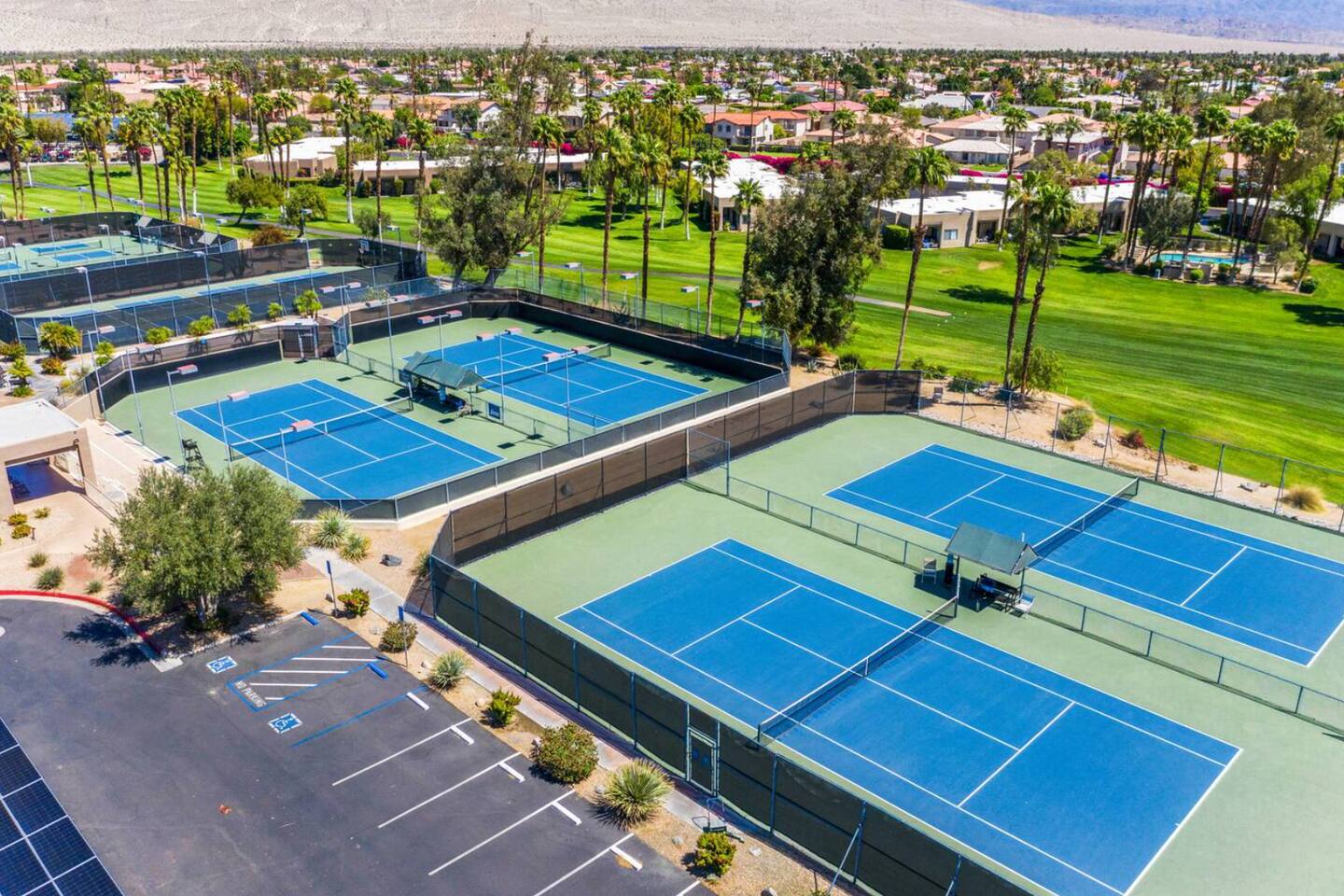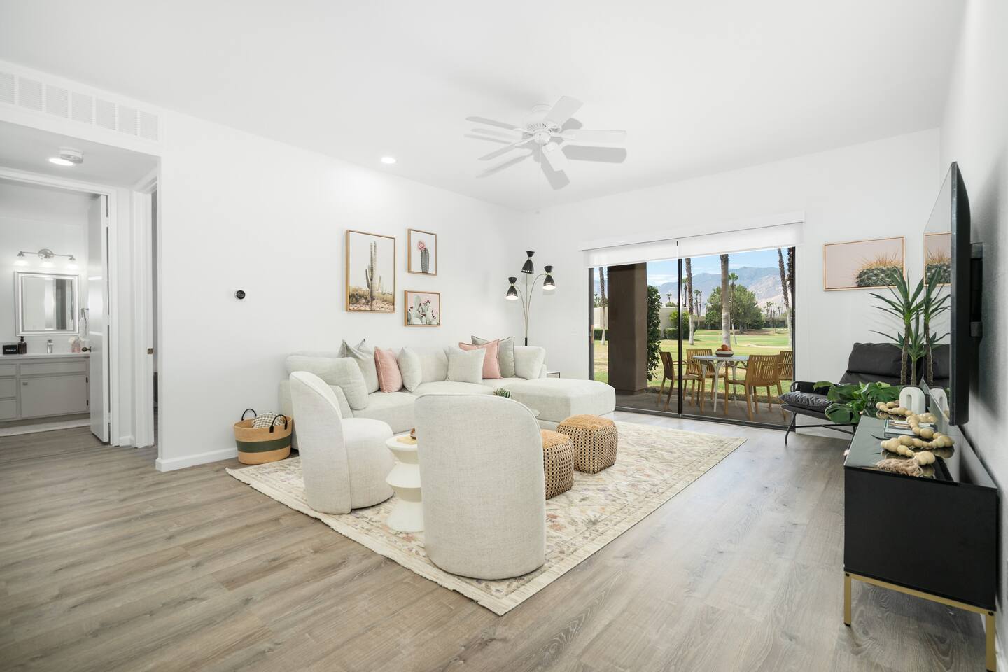 --- INTERIOR DETAILS --- This condo accommodates up to 4 guests with 2 dual primary bedrooms & 2 full ensuite bath\Additional spaces include a fully stocked kitchen, dining space, living room, garage and laundry space. BEDROOMS: ●Bedroom #1 in pictures: King bed with ensuite bath, nightstands, table lamps, dresser, smart tv, walk-in closet, luggage rack, ceiling fan, private access sliding door to the back patio. ●Bedroom #2 in pictures :King bed with ensuite bath, nightstands, table lamps, working desk, closet, luggage rack, ceiling fan, private access sliding door to back patio. ●Bathroom #1: Standing shower, dual vanity, hairdryer, makeup towels ●Bathroom #2: Standing shower, dual vanity, makeup towels --- EXTERIOR DETAILS --- ●Pool & Spa: Community pool and & Spa are a short 2 minute walk when you exit left from the front of the property ●Patio: Lounge seating, outdoor dining for 4, Gas BBQ ●Private Garage with access for 1 vehicle, garage remote provided ---LOCATION--- The condo is located on Isleta Ct which is the best street in the Desert Princess community. It’s a private dead end street away from the busy roads and close to community amenities. Guests are approximately one block from the newly renovated gym, spa, tennis centre, pickleball courts, full size driving range, renovated clubhouse and EV charger parking spots. Guests get a discount at the award winning golf course. (Rated among the best in the valley by golf digest). Tennis, pickle ball and golf clinics available. ---COMMUNITY--- Desert Princess country club and resort is a gated community built around a 27 hole Championship PGA golf course. The Resort boasts 34 community pools and is Ideally located just 10 minutes to the airport and 15 minutes to downtown Palm Springs.