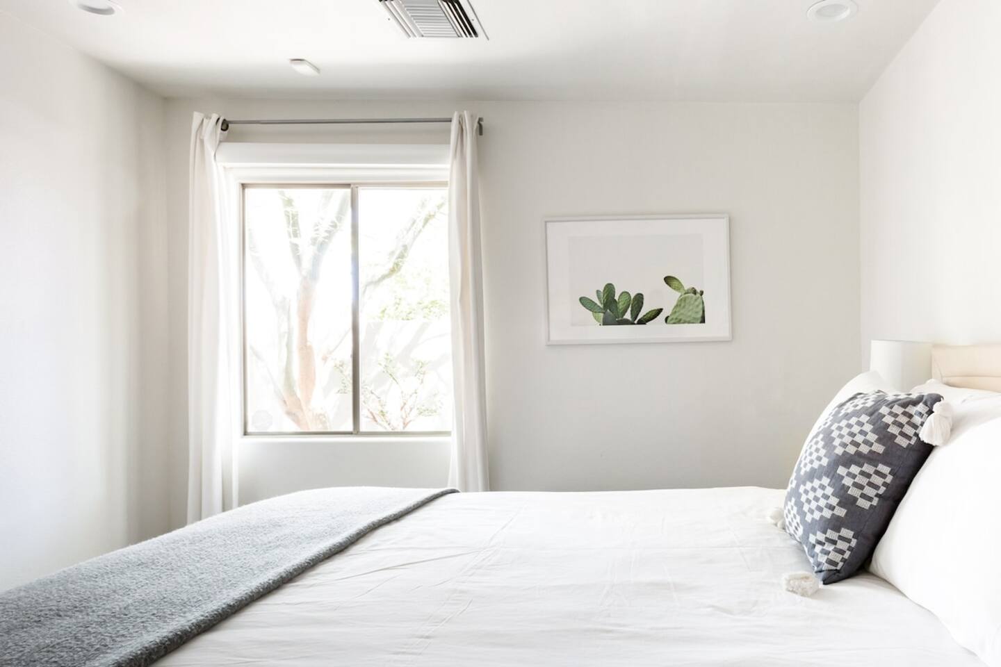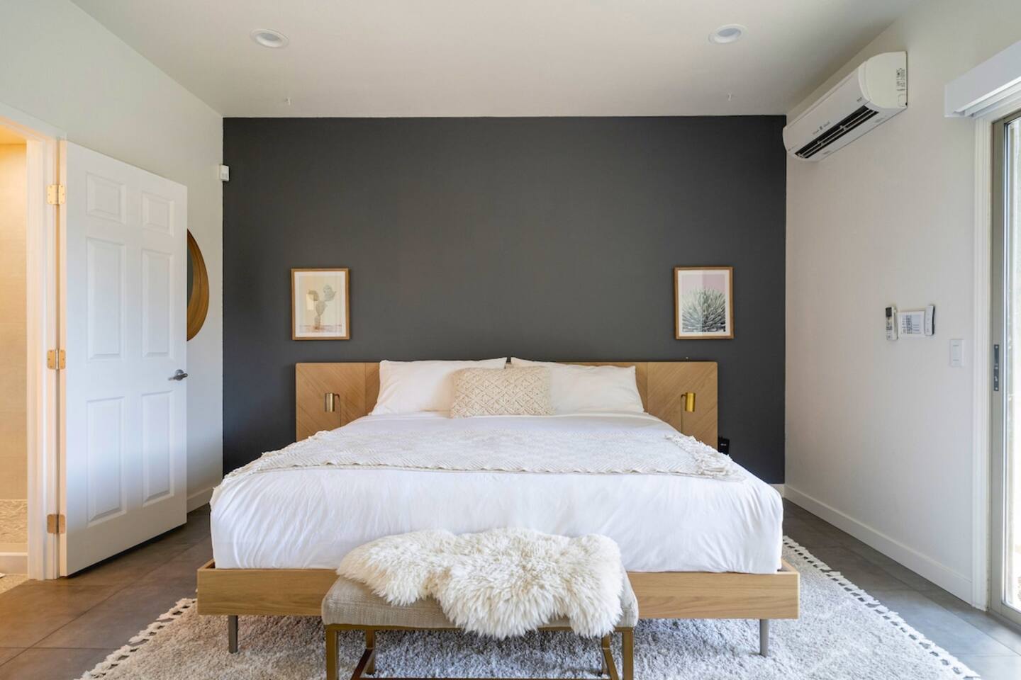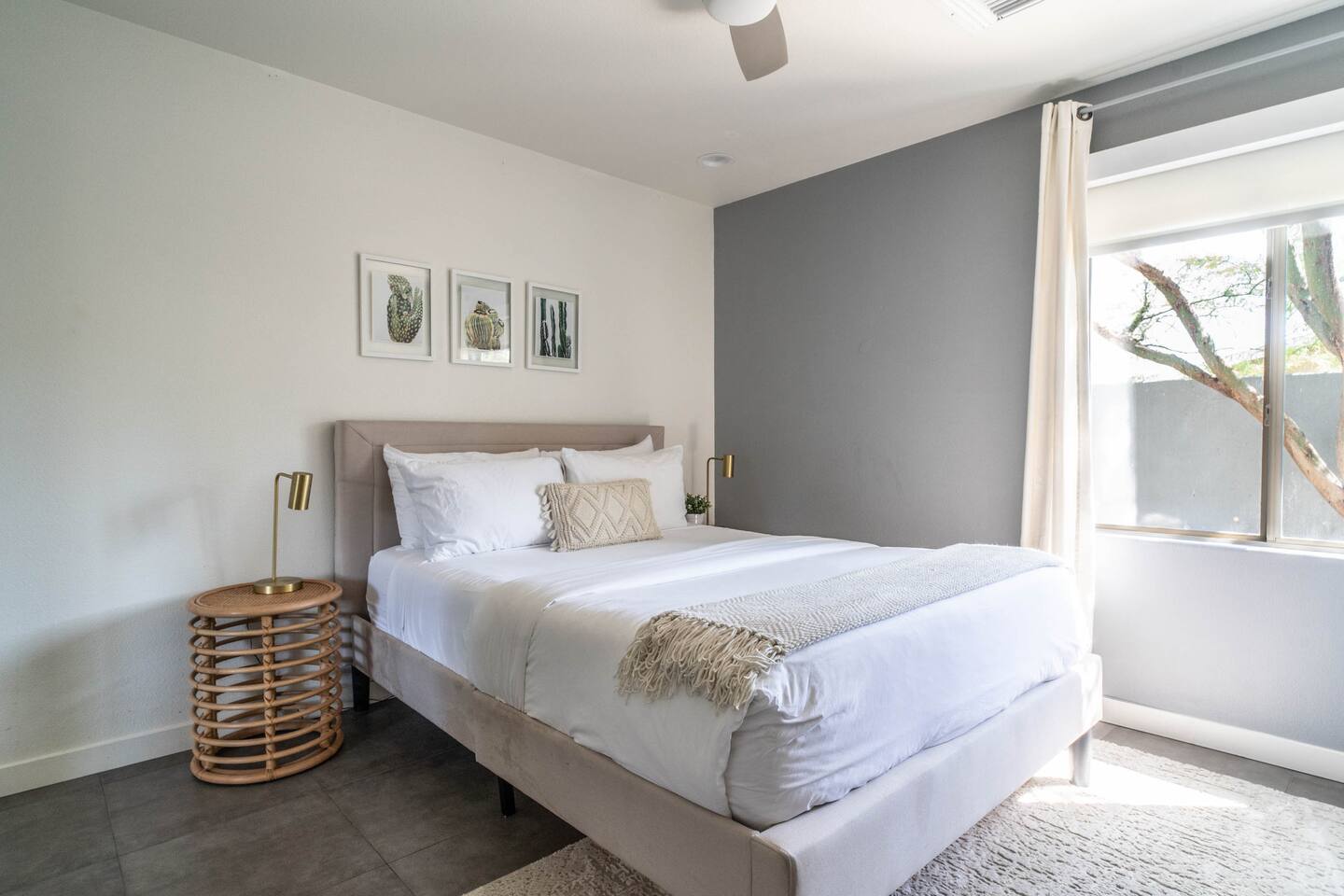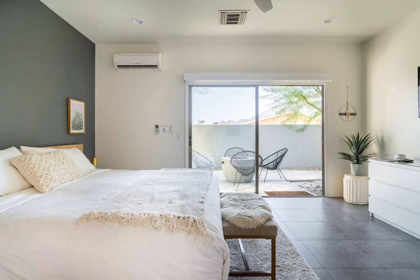 Steps away from hiking trails, charming Old Town, and a short drive to the Empire Polo Field. Modern pool home in the beautiful La Quinta Cove with all brand new furnishings in a minimalistic and desert chic style. The Grey House features 3 bedrooms, 2 bathrooms, and an open floor plan in the living, dining and kitchen areas. Relax in the stunning front courtyard featuring a sparkling pool with lush landscaping and sweeping mountain views, or enjoy sipping on wine in the backyard around the fire pit. This home is guaranteed to give you the relaxing and stress free vacation you deserve and need. ACCOMMODATIONS: Sleeps 6. Master Bedroom: King Size bed, Smart TV with cable, walk in closet, ensuite bathroom with full bath. 2 twin memory foam roll away beds are available to use as well. Guest Bedroom 1: Queen bed and walk in closet. Smart TV. Pack n' play available in closet if needed for the little ones. Guest Bedroom 2: Queen bed. Smart TV and dresser. Living Room: All brand new modern furnishings, 65” 4K Smart HDTV with cable tv and netflix ready. Kitchen: The kitchen is fully equipped with everything you'll need to enjoy your vacation. Blender, toaster, pots and pans, cutlery and cooking utensils. There are dishes, cups, bowls, glasses and flatware settings for 8+. Stainless steel appliances and dishwasher. Or, enjoy the beautiful patios and use the brand new BBQ outside! Laundry Room: Washer & dryer available for your use Outside: The front courtyard features a beautiful pool with lush landscaping, overlooking the sweeping mountain views. The middle courtyard is perfect for dining al fresco with a patio table and a brand new stainless steel BBQ. The backyard is private and quiet and can be accessed directly from the master suite. Enjoy coffee or a glass of wine around the fire pit. There is also a 2 car garage for your own use. Other Amenities: This home has central air conditioning, heating, a digital Nest thermostat, washer and dryer, free high-speed wireless and of course all linens and pool towels. La Quinta Cove is next to the scenic Waldorf Astoria La Quinta Resort. Also adjacent is charming Old Town with restaurants, a wine bar, and brewery, plus movie theaters. Replenish provisions at nearby shops, and at weekend farmers' markets. DISCLOSURES: The property has one security camera on the front of the garage to monitor the driveway and street of the property for your security and ours. It is not meant to invade your privacy, and the camera does not pick up any footage from the pool area, front yard, inside or back of house.