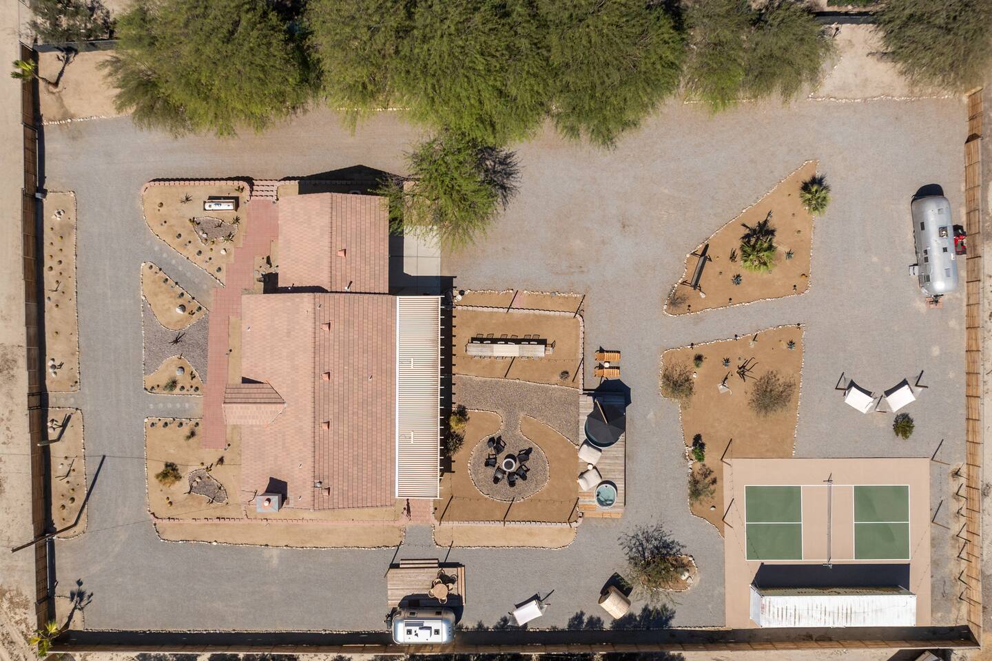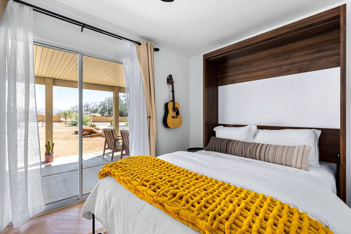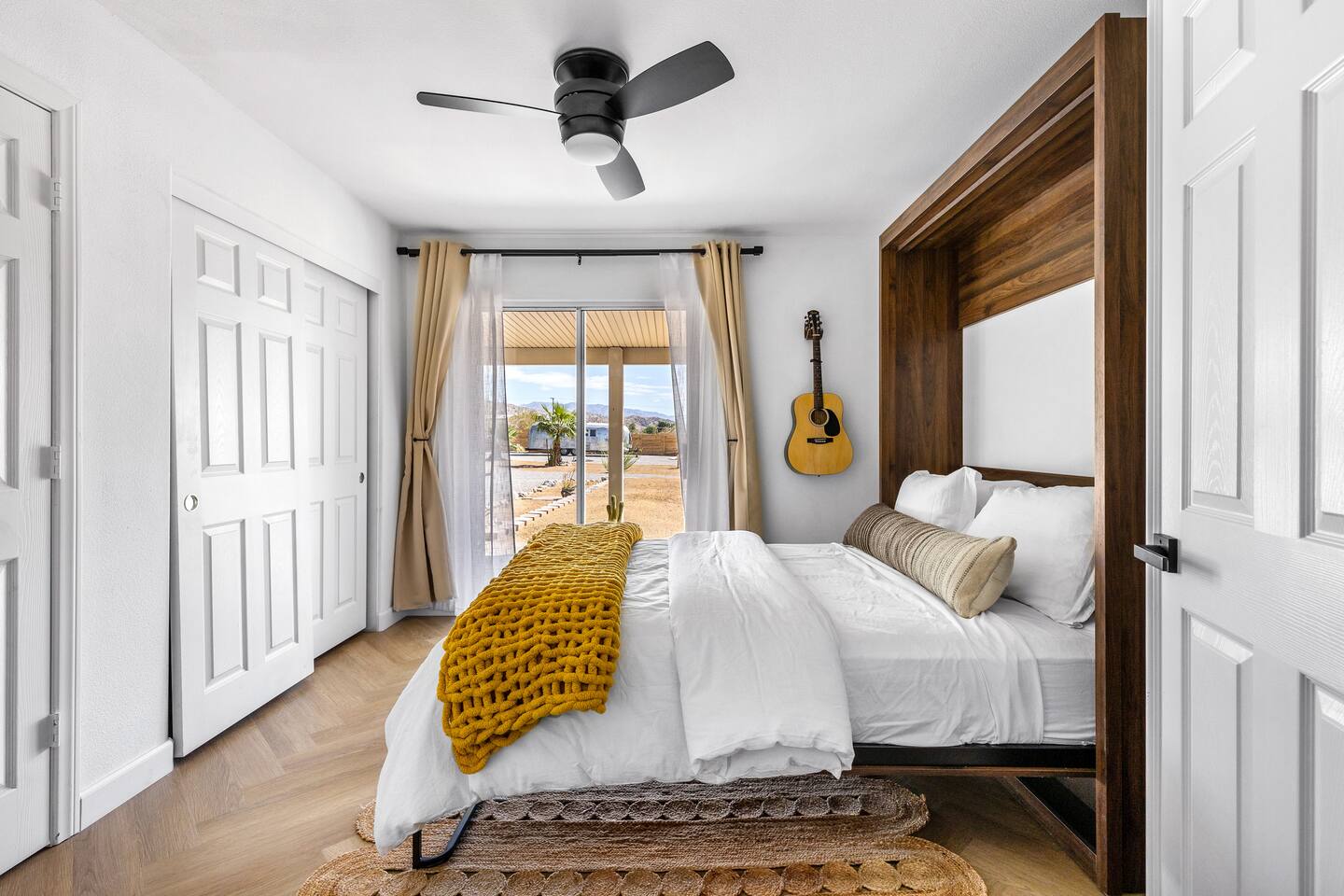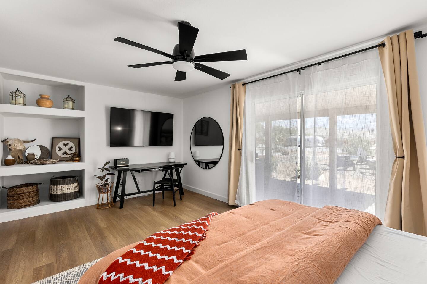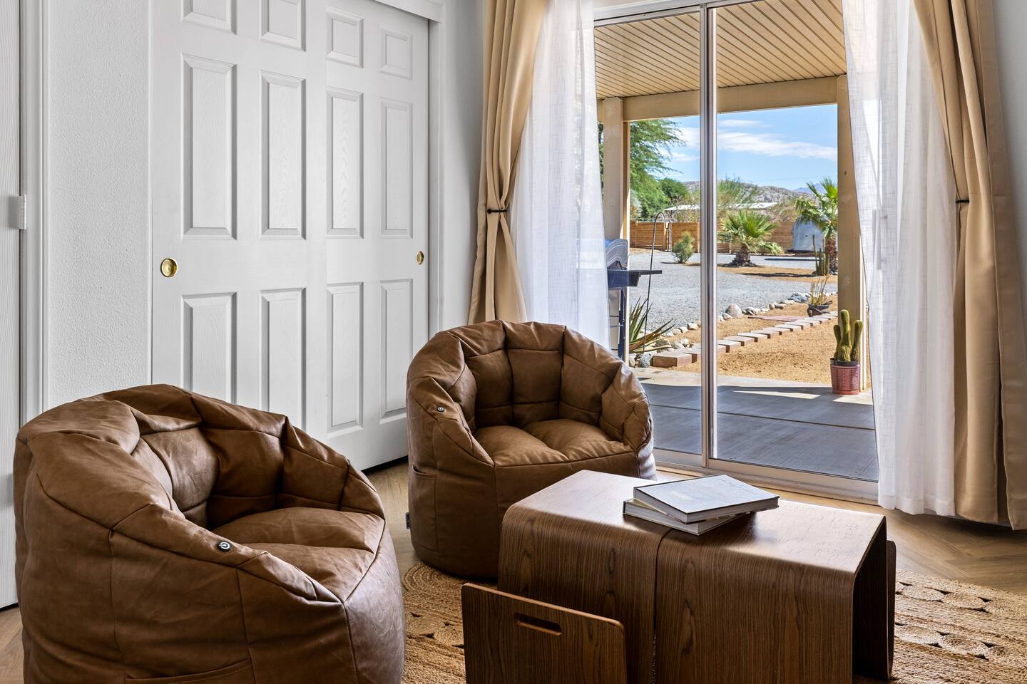 Desert Moon: Bedroom Breakdown. #1 - Master Bedroom - King with ensuite Master bathroom and walk in closet. Sliding door with access to backyard #2 - Bedroom - Queen bed #3 - Bedroom - Queen Murphy Bed. Sliding door with access to backyard. Note: this room will be set up as a Music room as pictured with coffee tables and chairs. Associated sheets and pillows will be in closet #4 - 23ft Airstream Bambi - Full Bed with small full bathroom, kitchenette and sofa area.