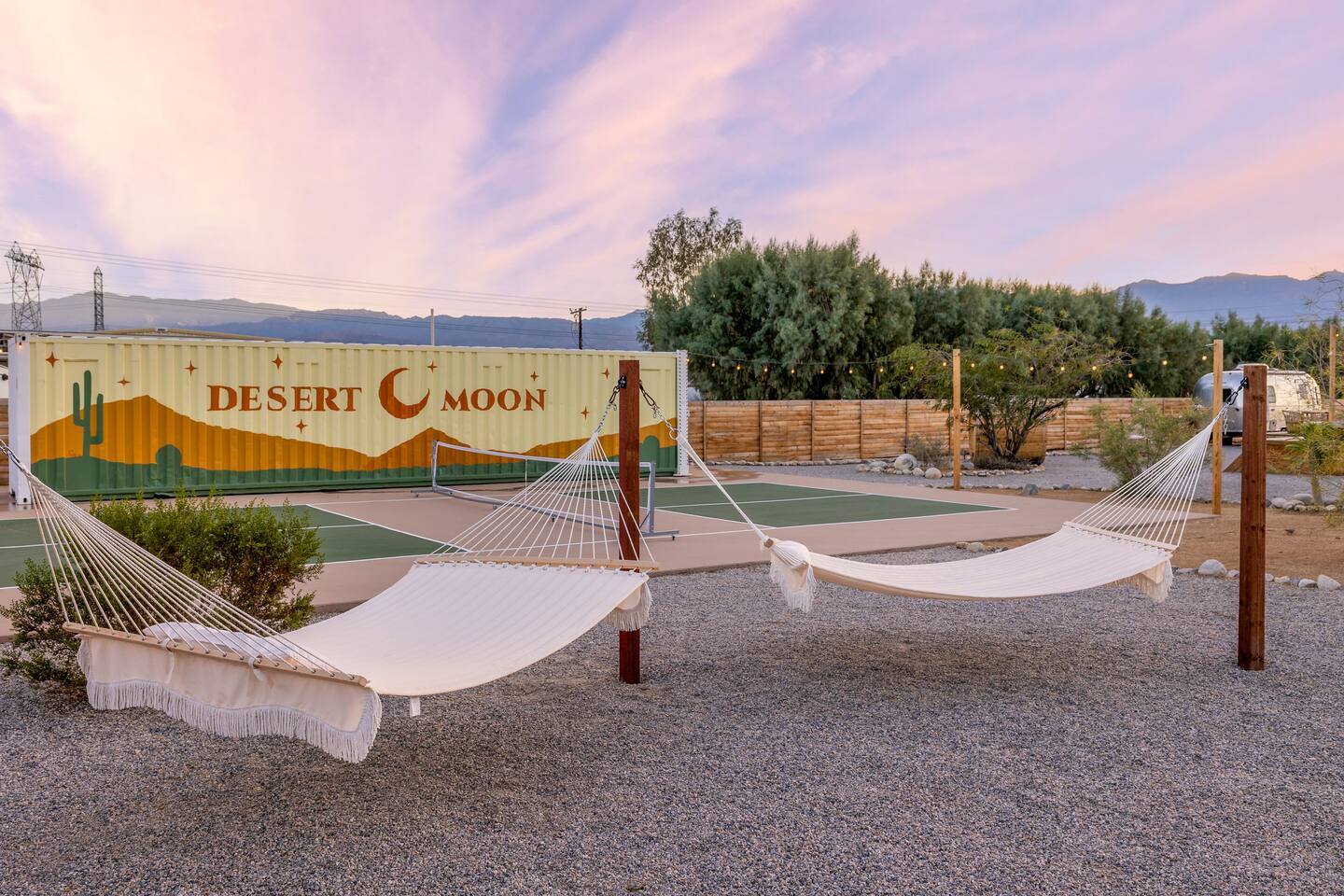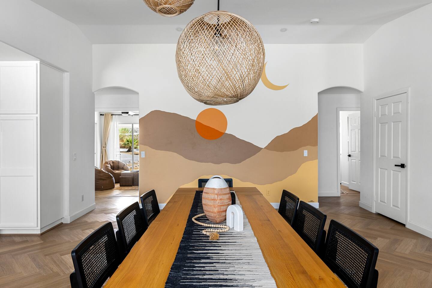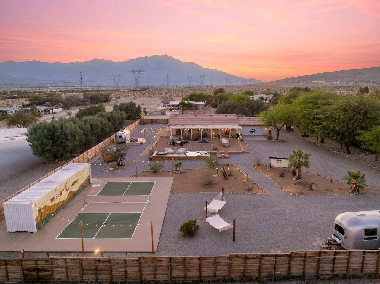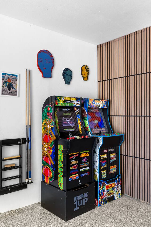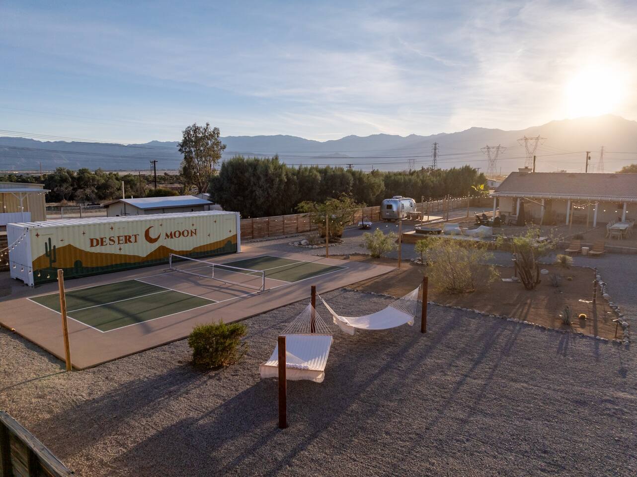 Desert Moon: Bedroom Breakdown. #1 - Master Bedroom - King with ensuite Master bathroom and walk in closet. Sliding door with access to backyard #2 - Bedroom - Queen bed #3 - Bedroom - Queen Murphy Bed. Sliding door with access to backyard. Note: this room will be set up as a Music room as pictured with coffee tables and chairs. Associated sheets and pillows will be in closet #4 - 23ft Airstream Bambi - Full Bed with small full bathroom, kitchenette and sofa area.