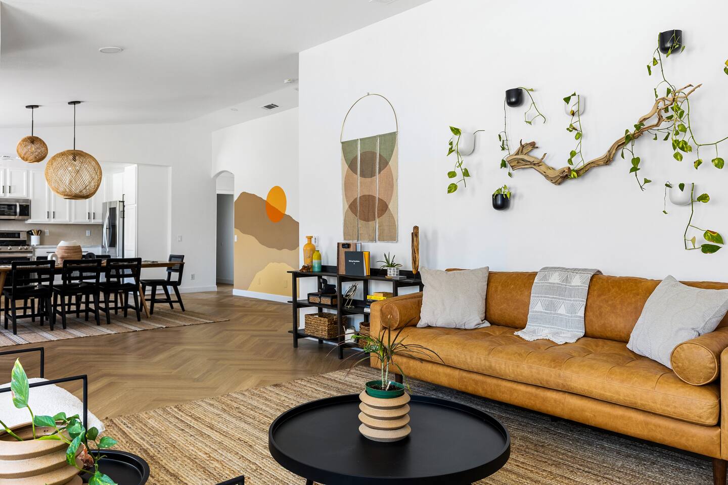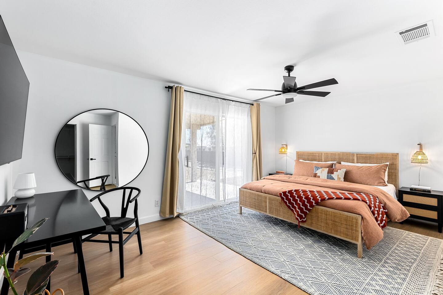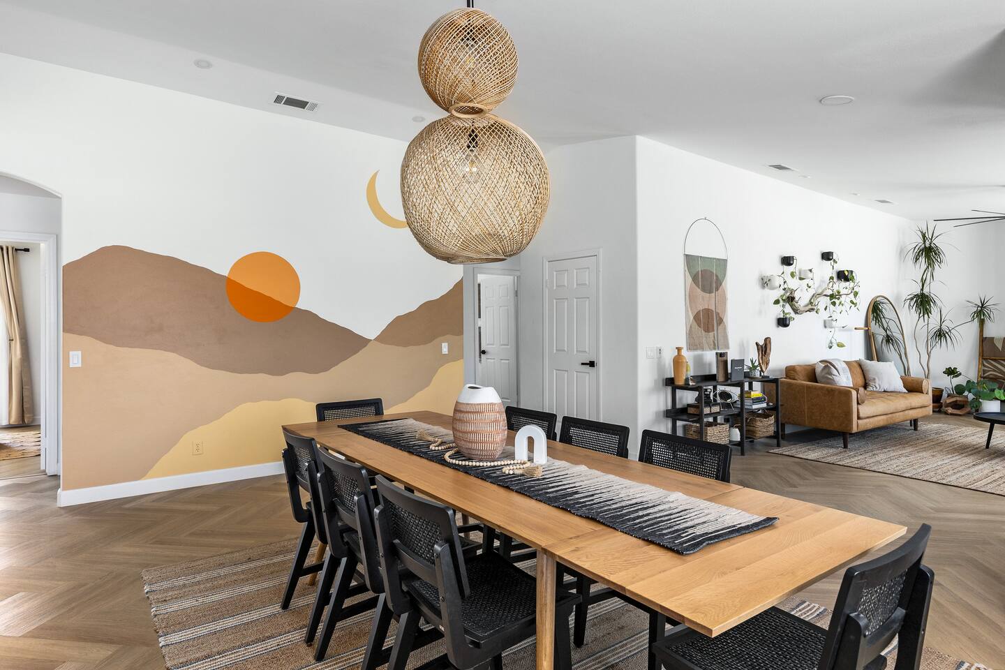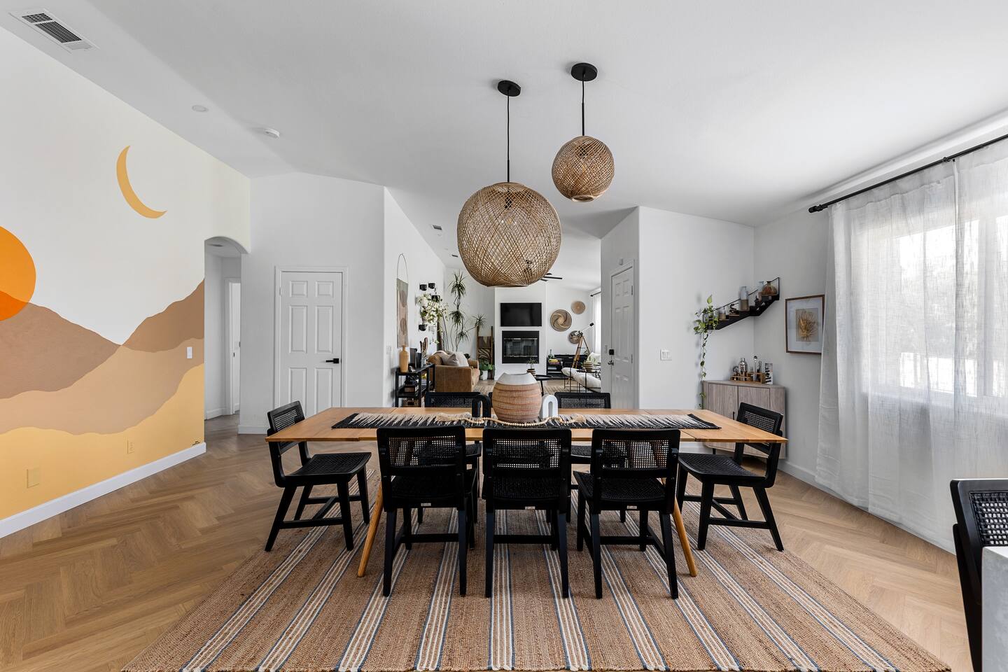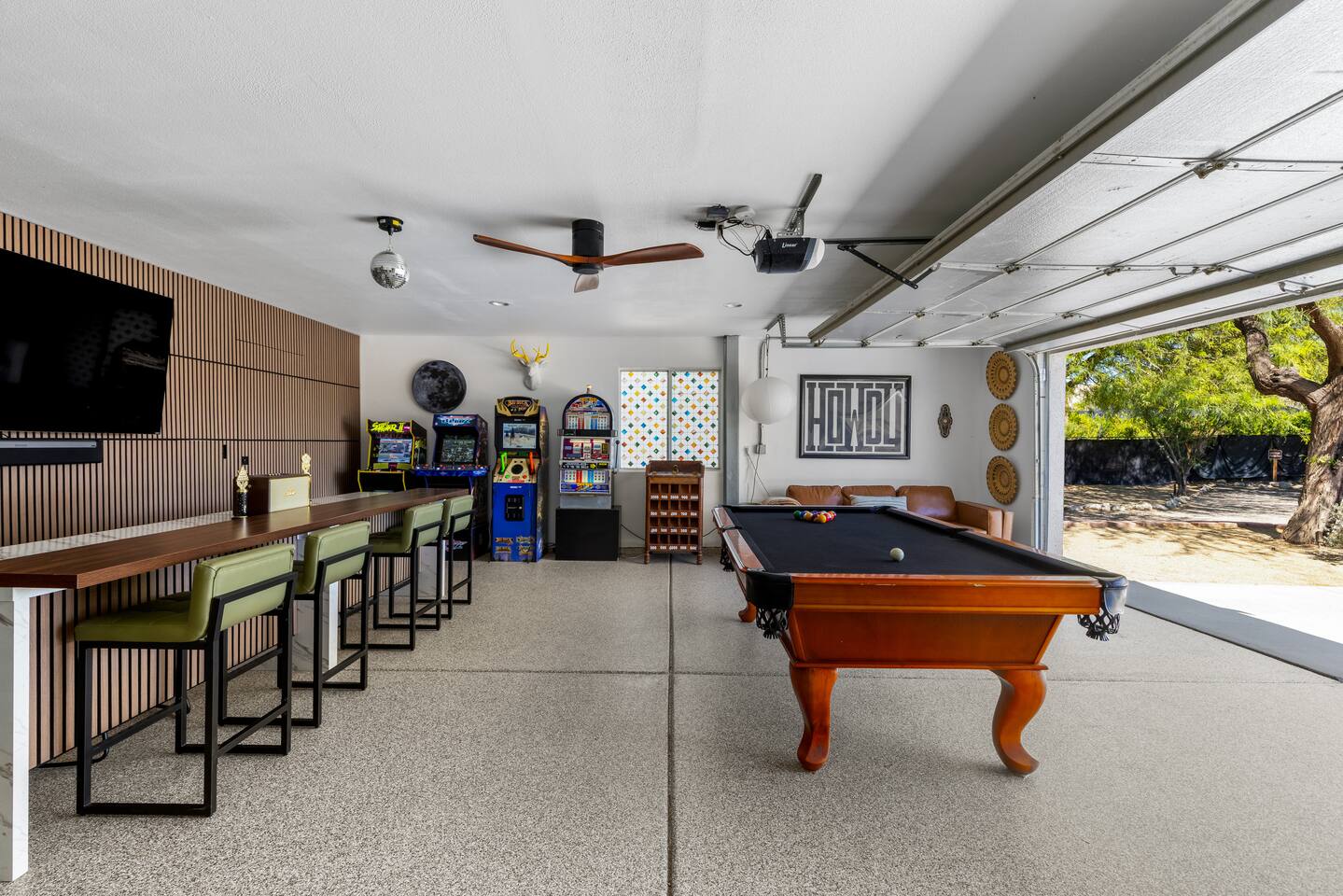 Desert Moon: Bedroom Breakdown. #1 - Master Bedroom - King with ensuite Master bathroom and walk in closet. Sliding door with access to backyard #2 - Bedroom - Queen bed #3 - Bedroom - Queen Murphy Bed. Sliding door with access to backyard. Note: this room will be set up as a Music room as pictured with coffee tables and chairs. Associated sheets and pillows will be in closet #4 - 23ft Airstream Bambi - Full Bed with small full bathroom, kitchenette and sofa area.