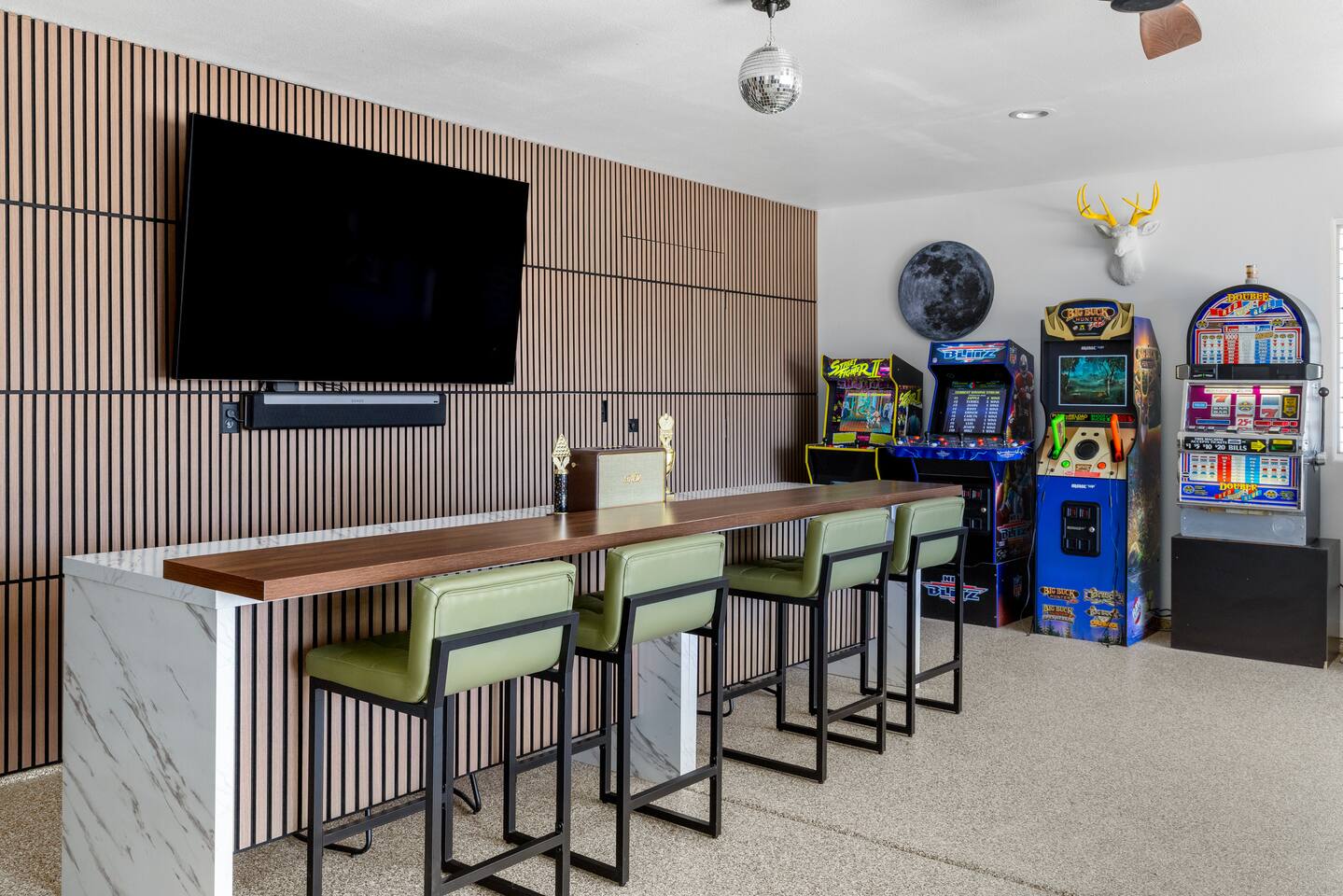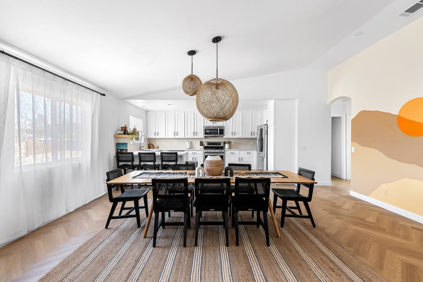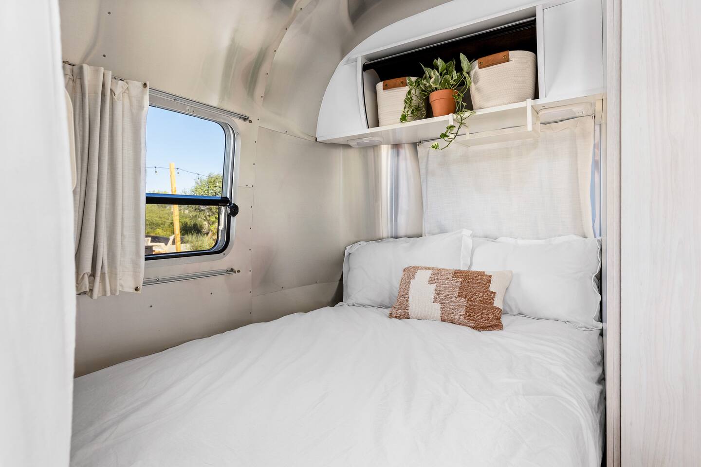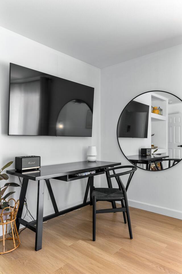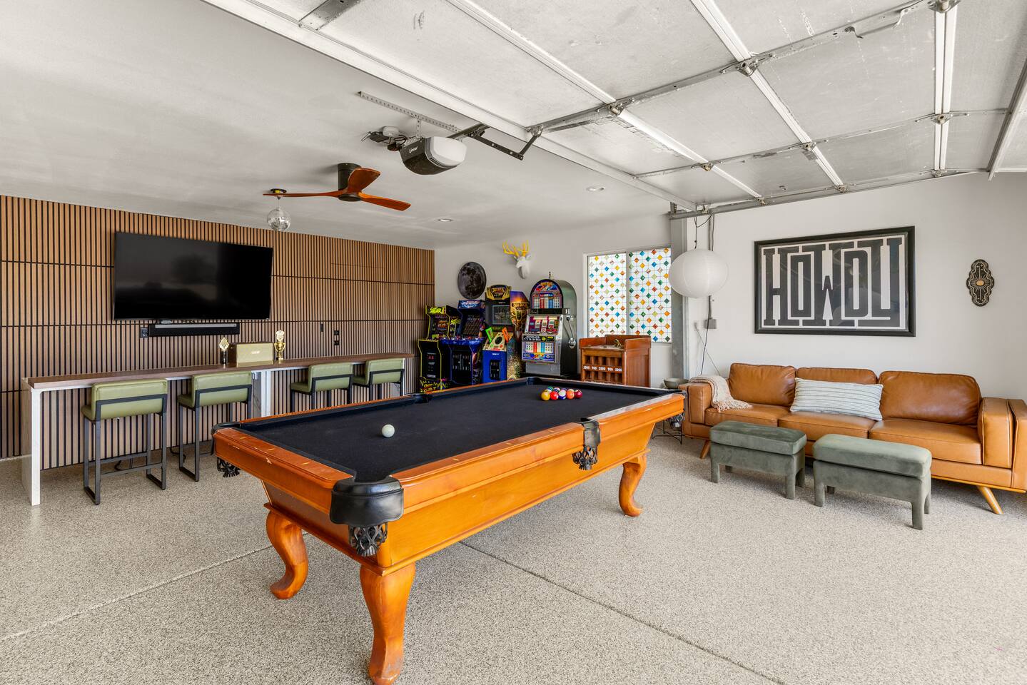 Desert Moon: Bedroom Breakdown. #1 - Master Bedroom - King with ensuite Master bathroom and walk in closet. Sliding door with access to backyard #2 - Bedroom - Queen bed #3 - Bedroom - Queen Murphy Bed. Sliding door with access to backyard. Note: this room will be set up as a Music room as pictured with coffee tables and chairs. Associated sheets and pillows will be in closet #4 - 23ft Airstream Bambi - Full Bed with small full bathroom, kitchenette and sofa area.