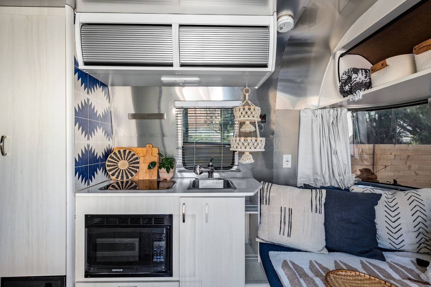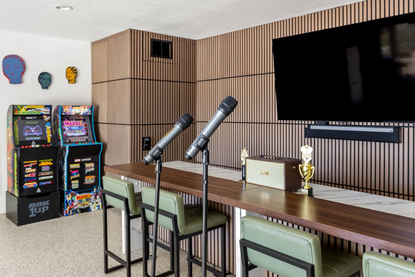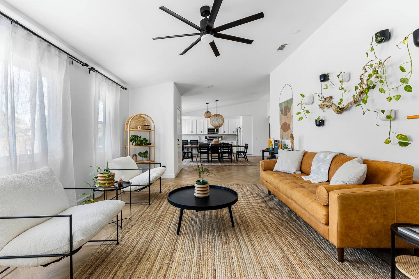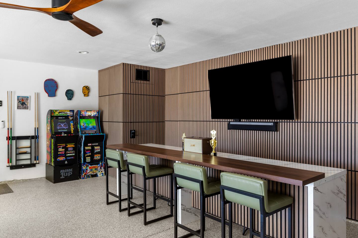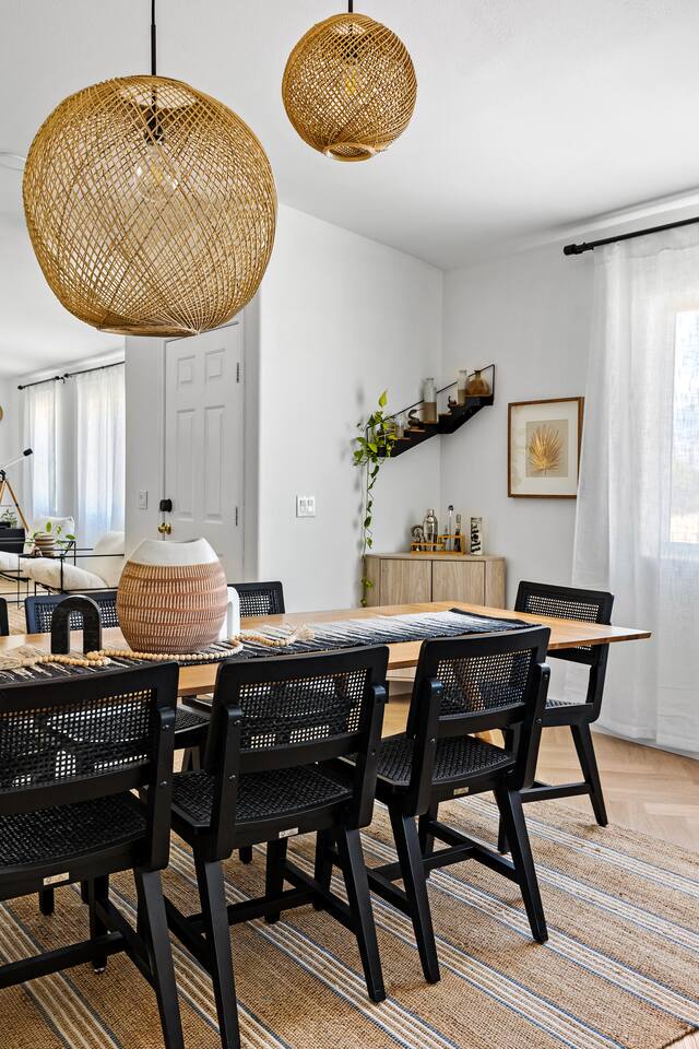 Desert Moon: Bedroom Breakdown. #1 - Master Bedroom - King with ensuite Master bathroom and walk in closet. Sliding door with access to backyard #2 - Bedroom - Queen bed #3 - Bedroom - Queen Murphy Bed. Sliding door with access to backyard. Note: this room will be set up as a Music room as pictured with coffee tables and chairs. Associated sheets and pillows will be in closet #4 - 23ft Airstream Bambi - Full Bed with small full bathroom, kitchenette and sofa area.
