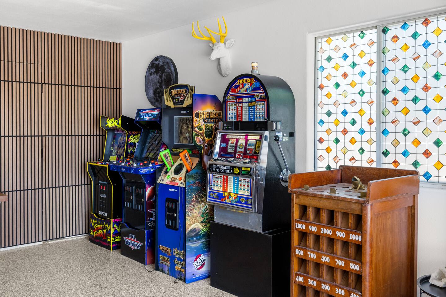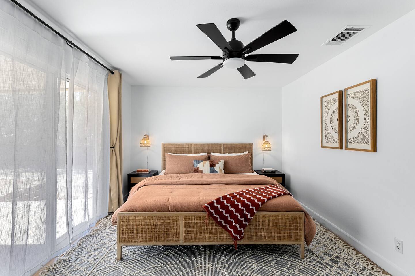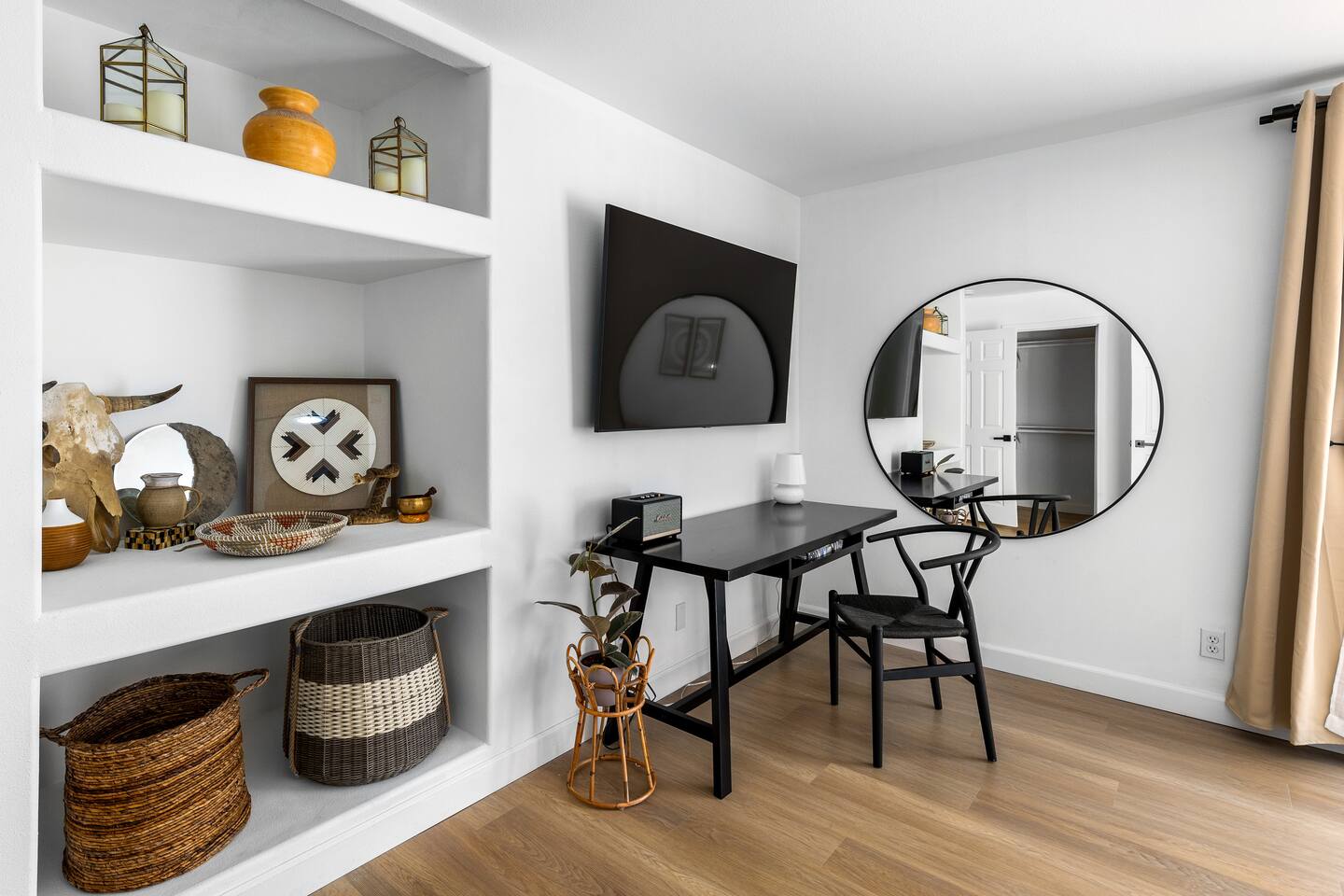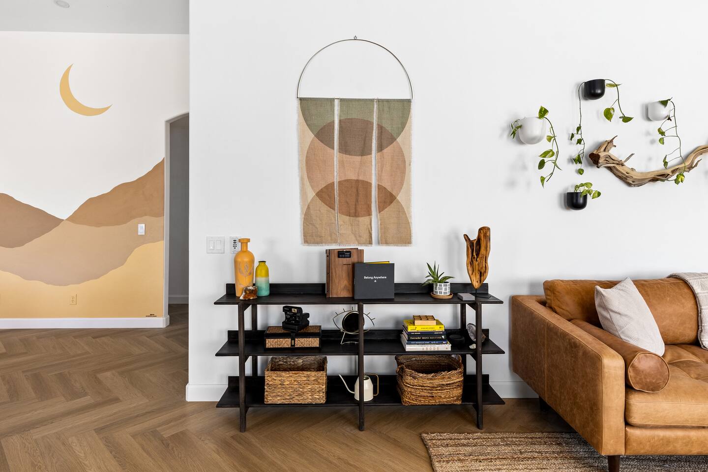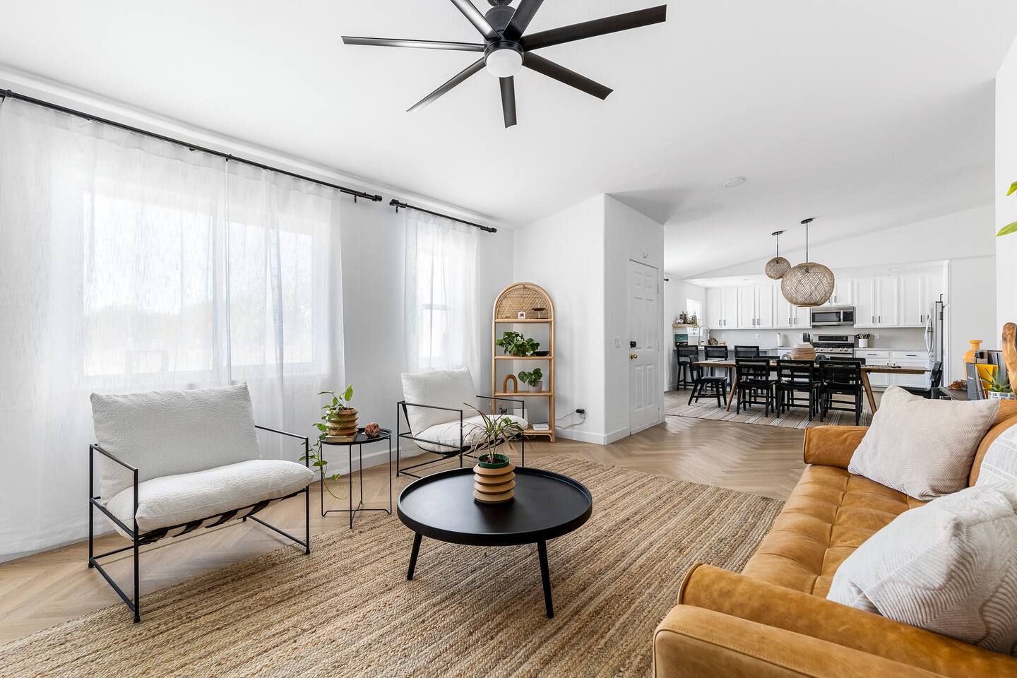 Desert Moon: Bedroom Breakdown. #1 - Master Bedroom - King with ensuite Master bathroom and walk in closet. Sliding door with access to backyard #2 - Bedroom - Queen bed #3 - Bedroom - Queen Murphy Bed. Sliding door with access to backyard. Note: this room will be set up as a Music room as pictured with coffee tables and chairs. Associated sheets and pillows will be in closet #4 - 23ft Airstream Bambi - Full Bed with small full bathroom, kitchenette and sofa area.