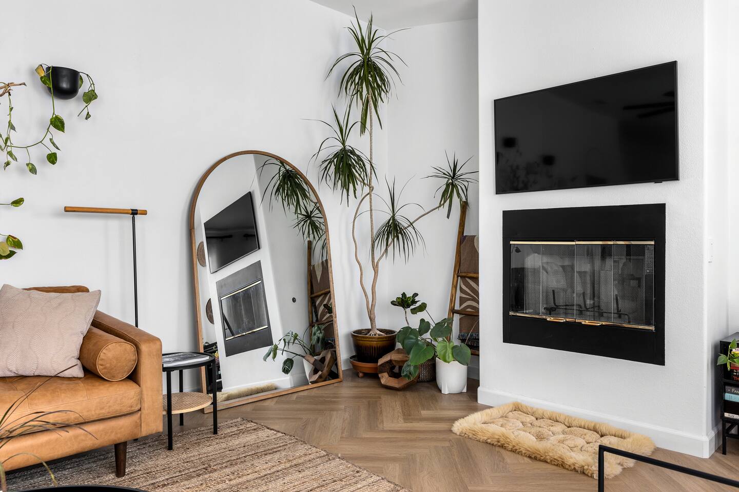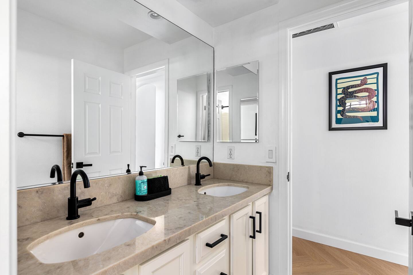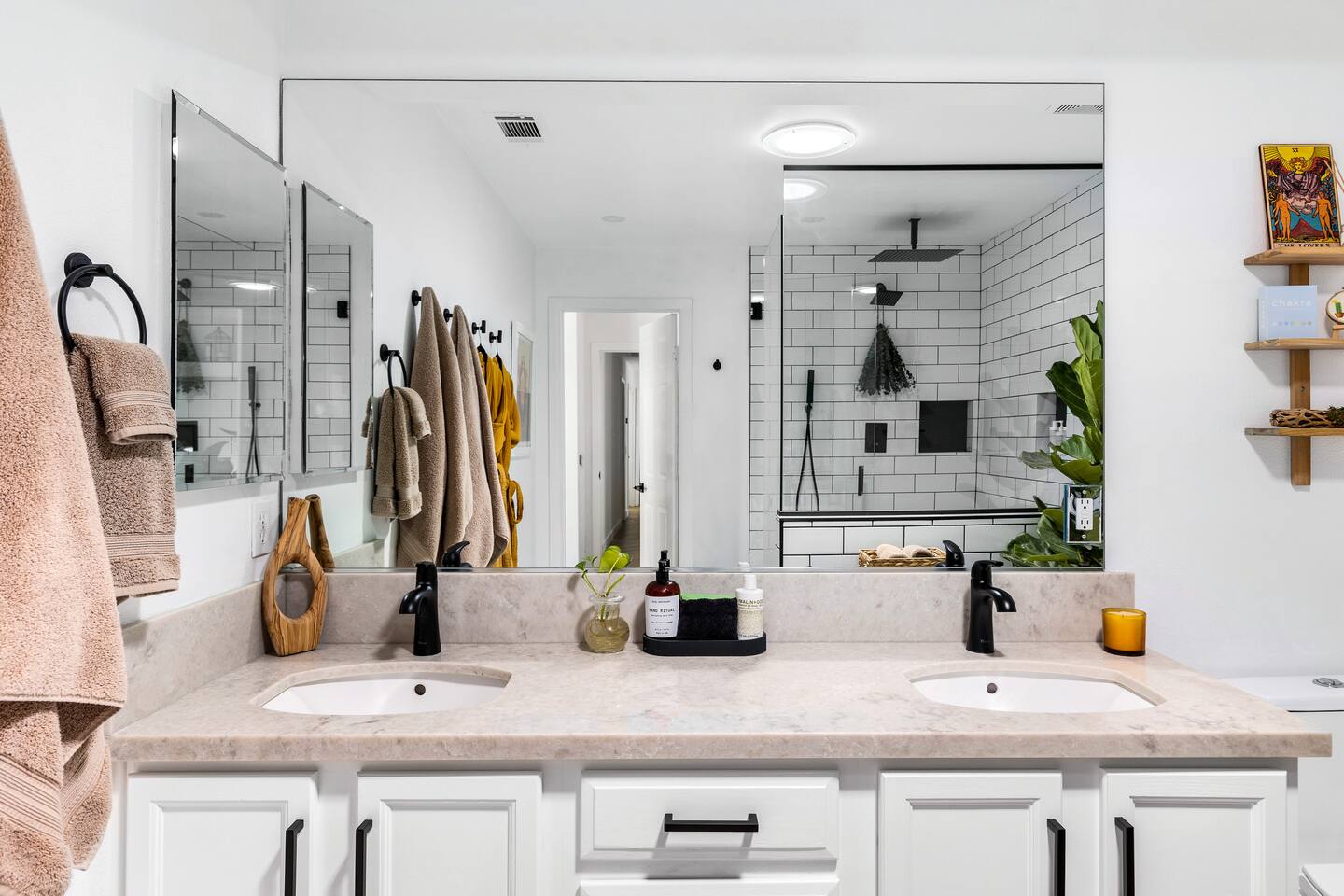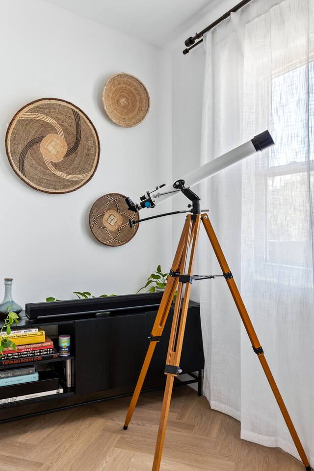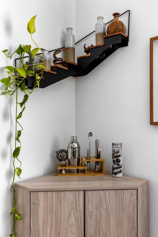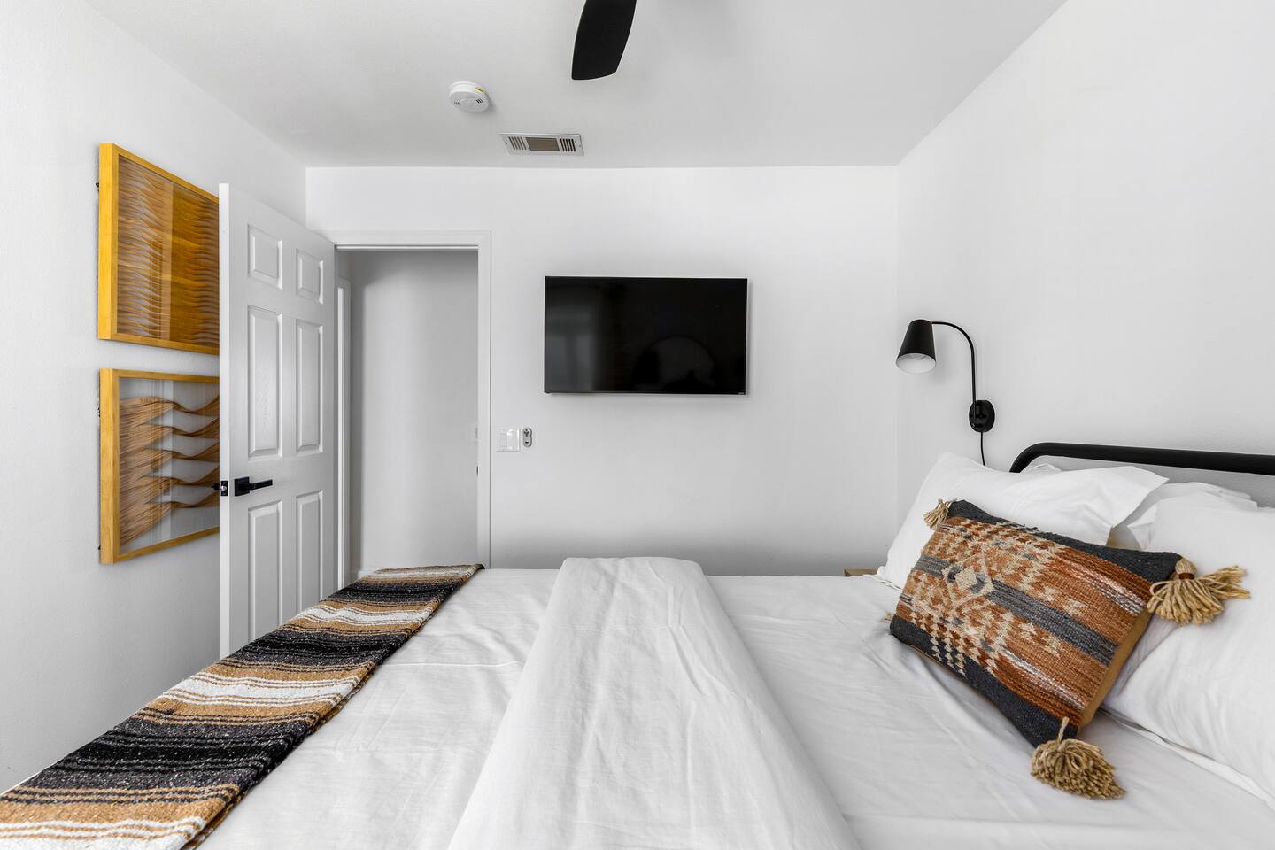 Desert Moon: Bedroom Breakdown. #1 - Master Bedroom - King with ensuite Master bathroom and walk in closet. Sliding door with access to backyard #2 - Bedroom - Queen bed #3 - Bedroom - Queen Murphy Bed. Sliding door with access to backyard. Note: this room will be set up as a Music room as pictured with coffee tables and chairs. Associated sheets and pillows will be in closet #4 - 23ft Airstream Bambi - Full Bed with small full bathroom, kitchenette and sofa area.