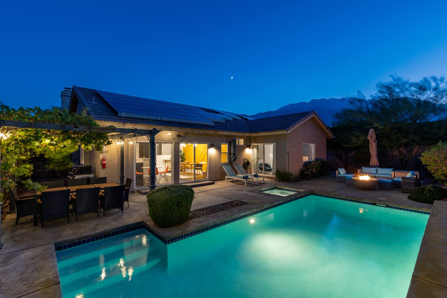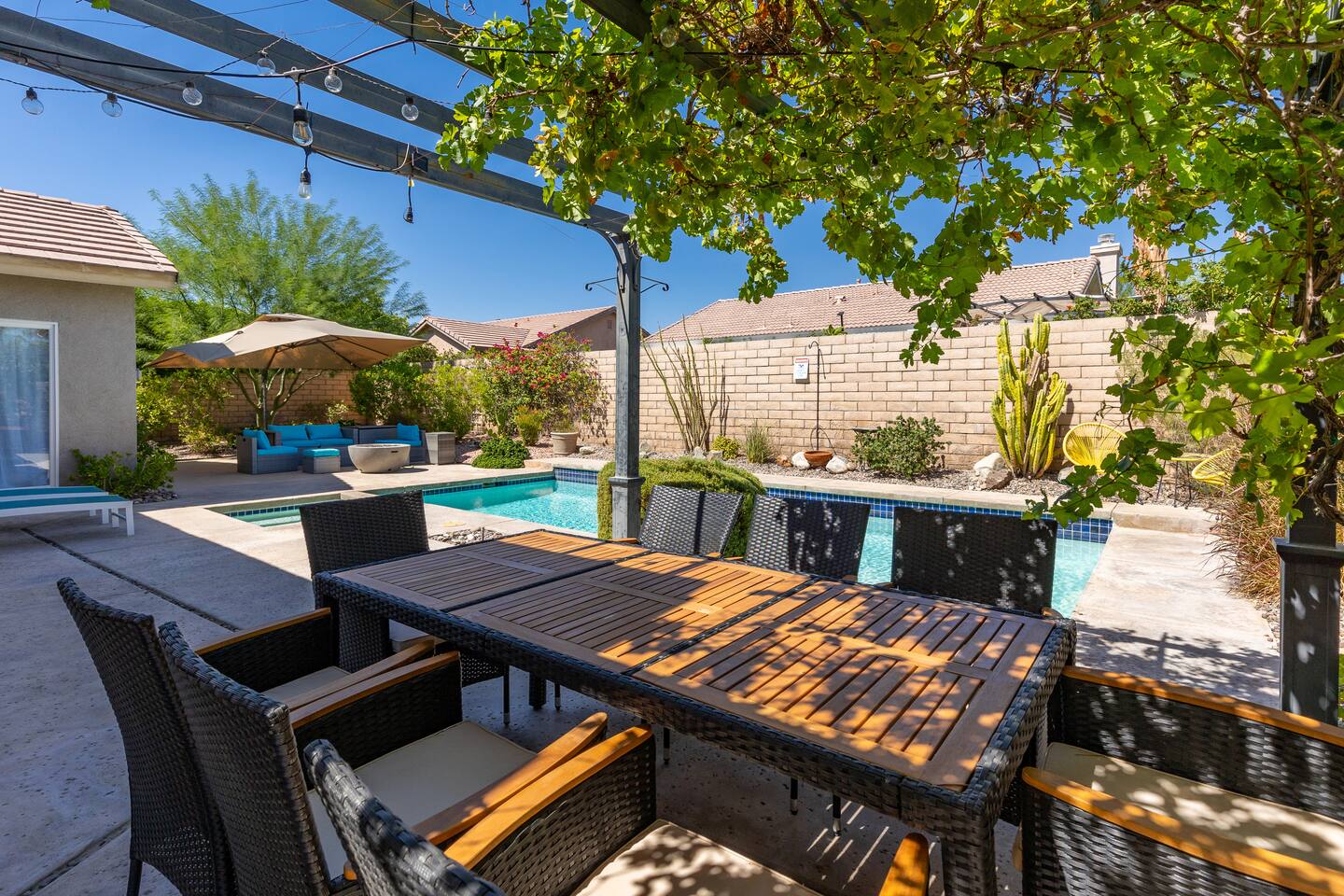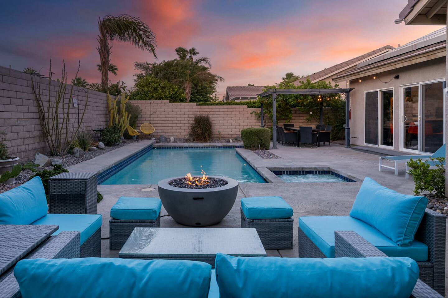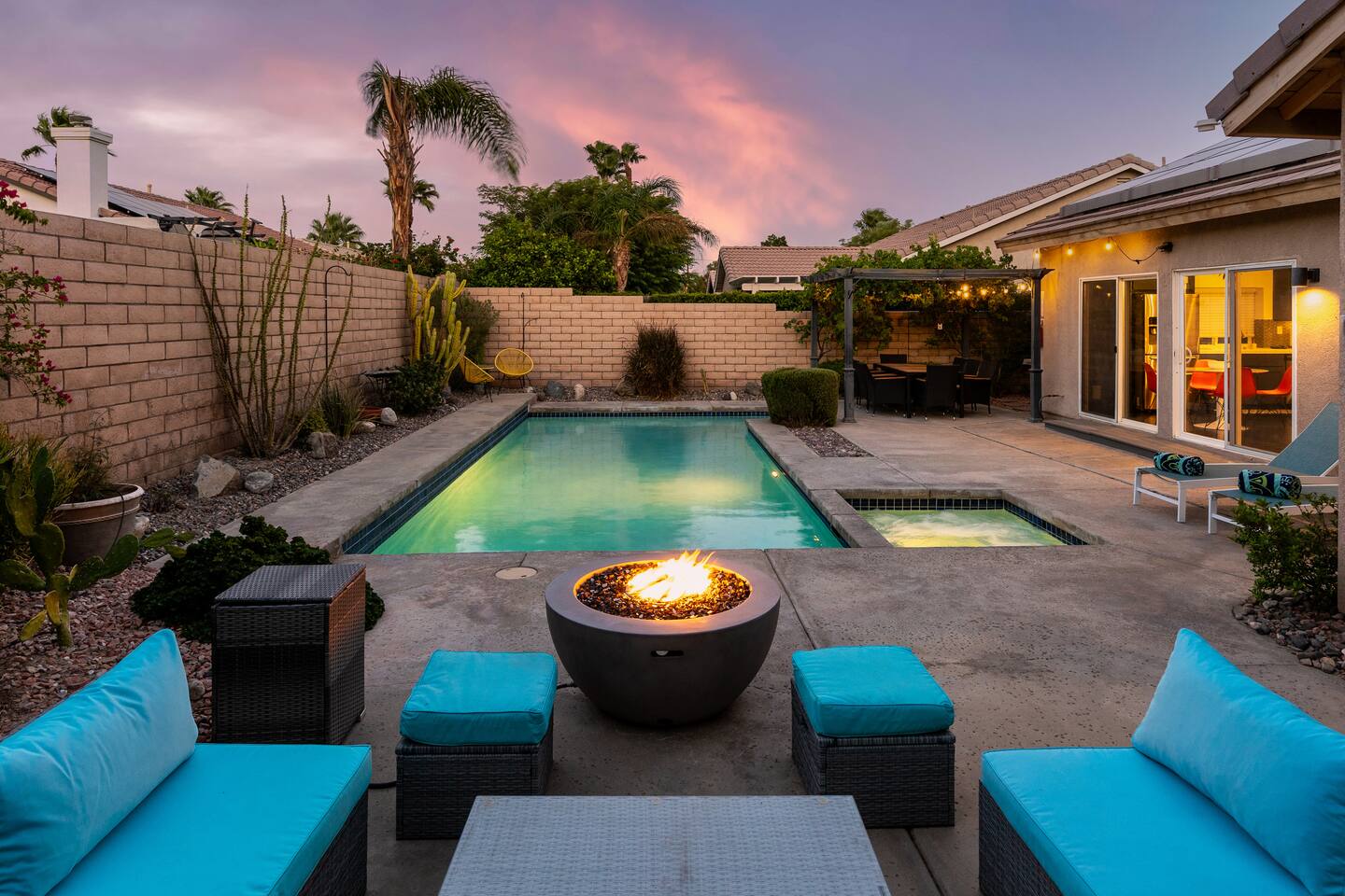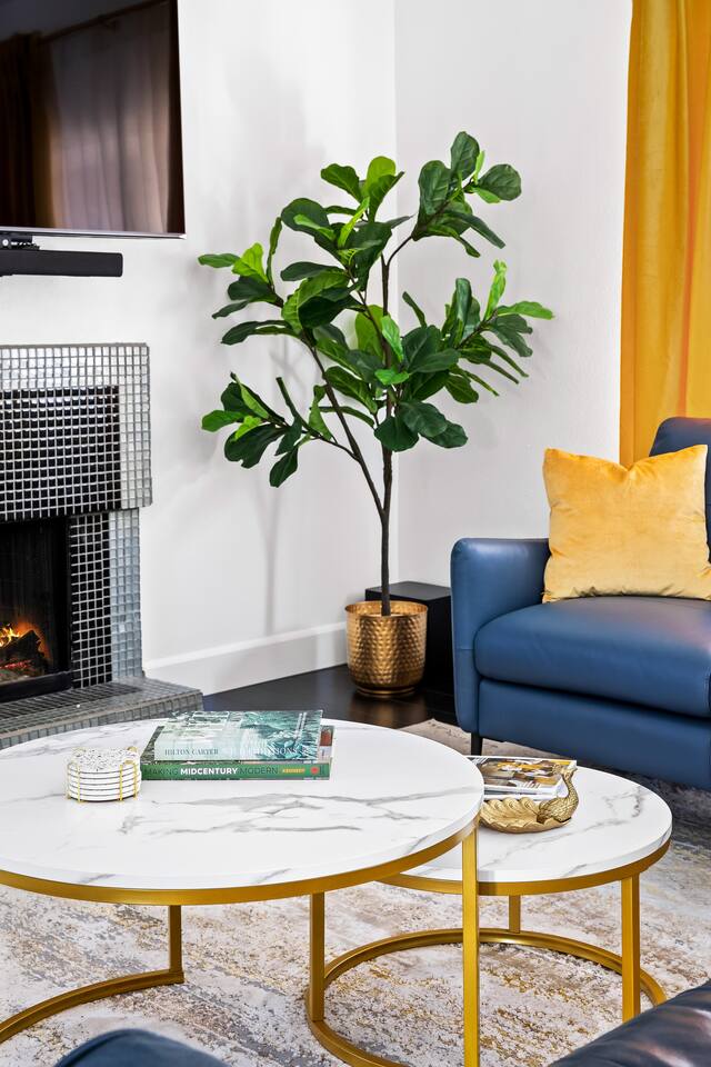 This is 4BD, 2BA home is ready for your group! Your group will enjoy the open layout of a spacious living room w/ gas fireplace and large Smart TV above. Also available is a dedicated desk with a monitor, this space is perfect for those needing to WFH. Our dining room table has seating for 8 and a bar cart nearby to mix cocktails/mocktails for your group. There is additional kitchen bar seating with 3 stools and a round mid century tulip breakfast table that seats 4. All seating overlooks the beautiful backyard pool. The Kitchen is fully stocked with all the tools and appliances you will need to prepare meals. Lastly, Head out back to the spacious and private backyard where you'll find your sparkling pool and hot tub. There are lounge chairs and two seperate seating areas with outdoor couches and fire pit(propane)or the outdoor table with string lighting that seats 8. Our gas BBQ is located on the side of the house. Our garage fits 2 vehicles and up to 4 in the driveway. This is a great home whether you're hosting a family outing, bachelorette party, or just a get-together with some close friends.
