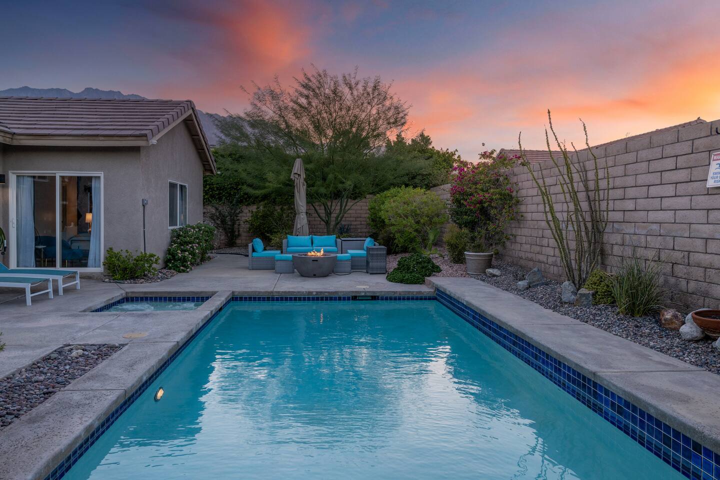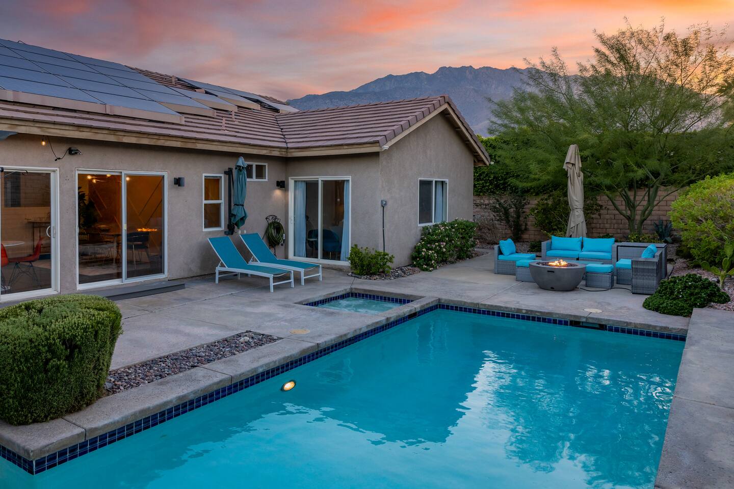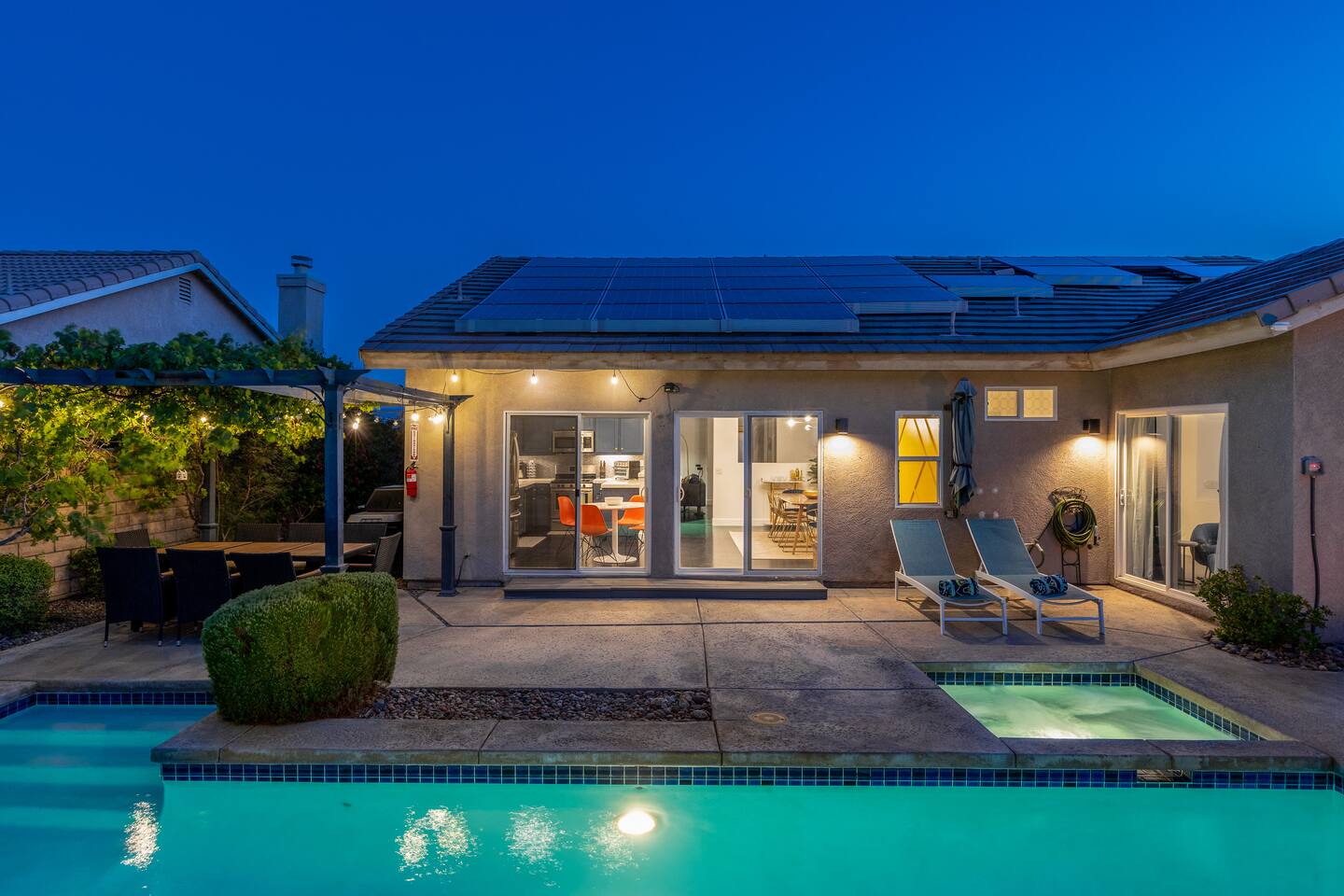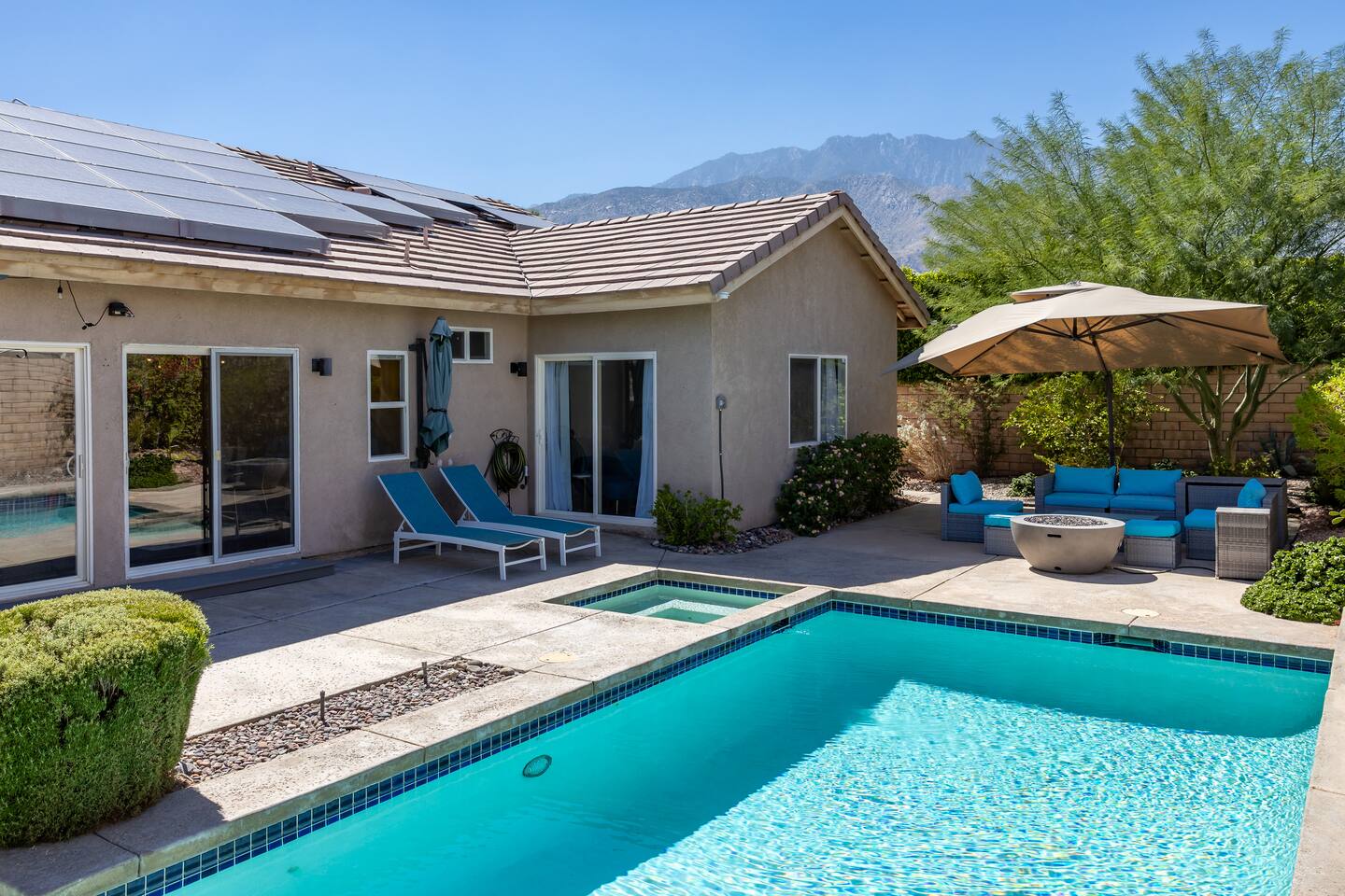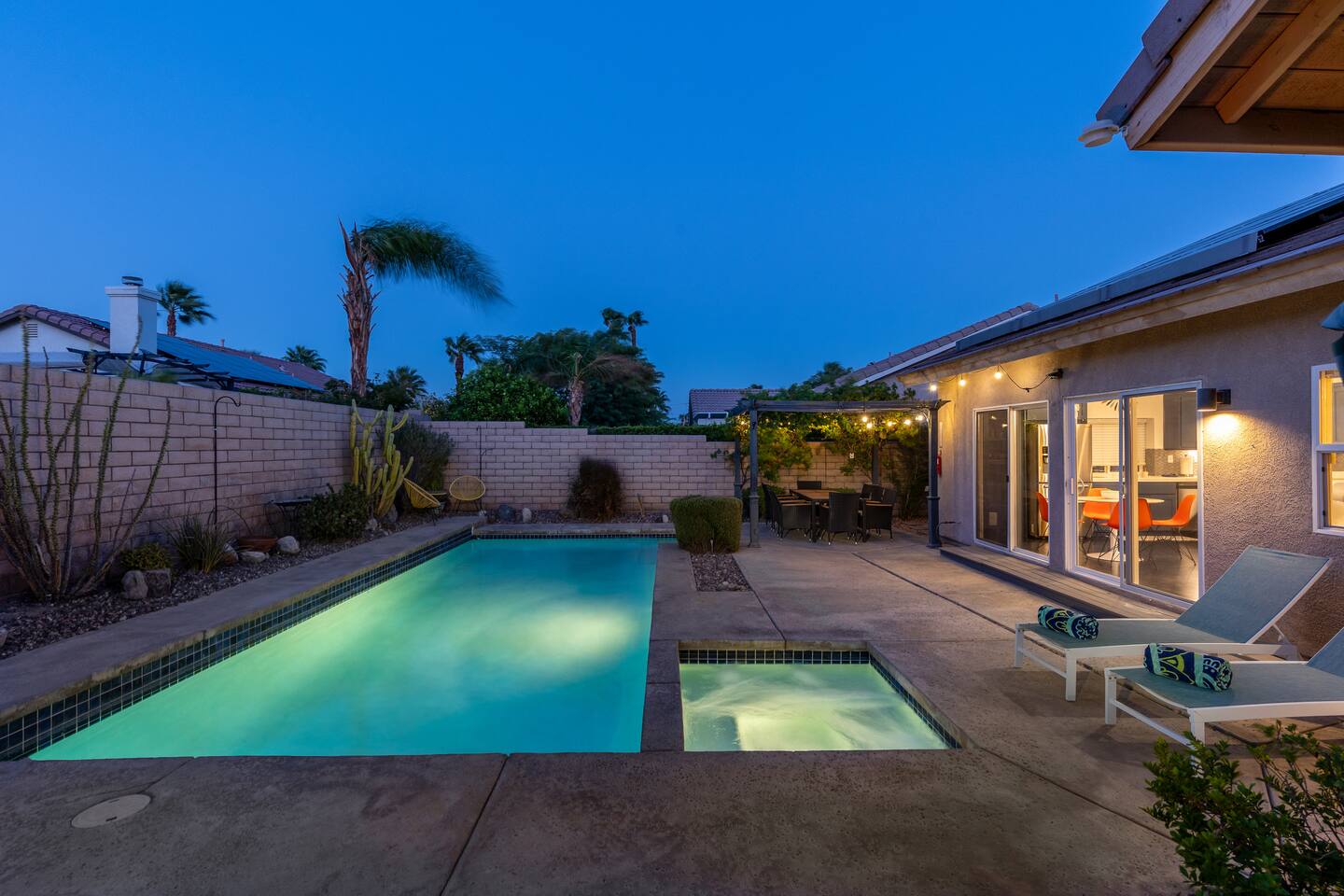 This is 4BD, 2BA home is ready for your group! Your group will enjoy the open layout of a spacious living room w/ gas fireplace and large Smart TV above. Also available is a dedicated desk with a monitor, this space is perfect for those needing to WFH. Our dining room table has seating for 8 and a bar cart nearby to mix cocktails/mocktails for your group. There is additional kitchen bar seating with 3 stools and a round mid century tulip breakfast table that seats 4. All seating overlooks the beautiful backyard pool. The Kitchen is fully stocked with all the tools and appliances you will need to prepare meals. Lastly, Head out back to the spacious and private backyard where you'll find your sparkling pool and hot tub. There are lounge chairs and two seperate seating areas with outdoor couches and fire pit(propane)or the outdoor table with string lighting that seats 8. Our gas BBQ is located on the side of the house. Our garage fits 2 vehicles and up to 4 in the driveway. This is a great home whether you're hosting a family outing, bachelorette party, or just a get-together with some close friends.