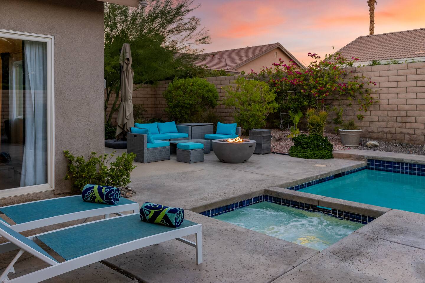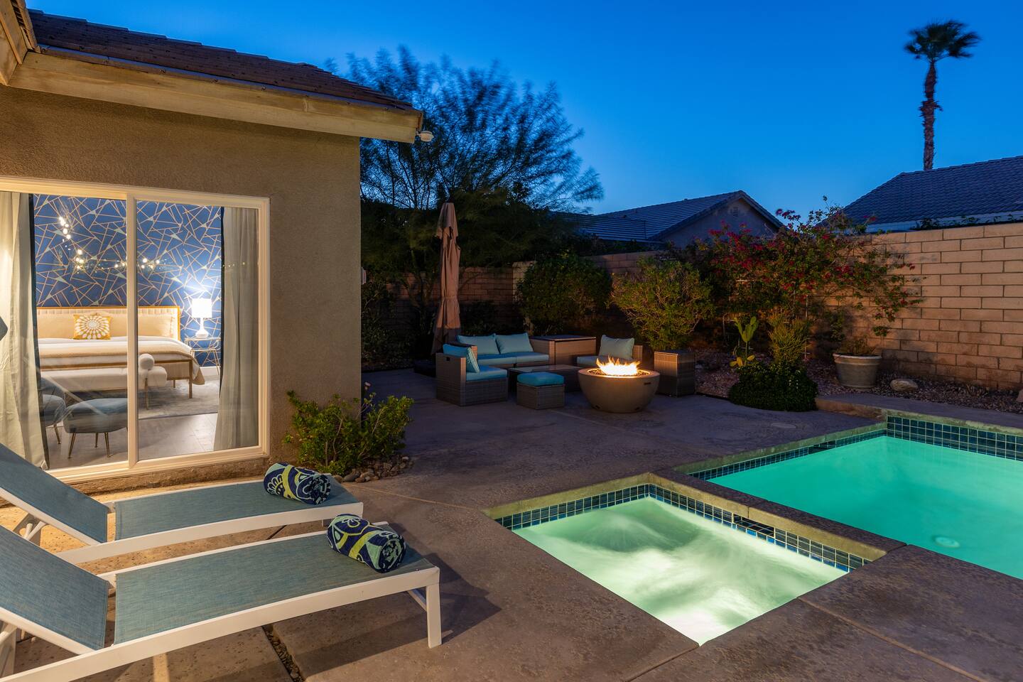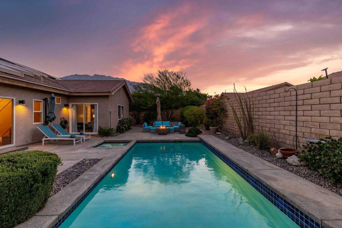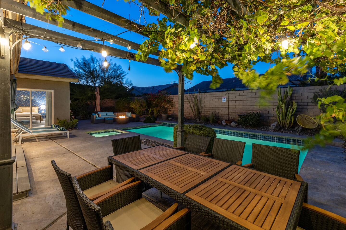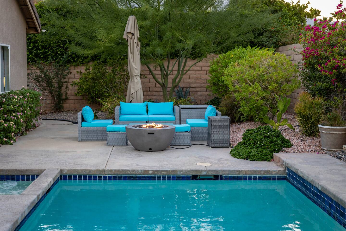This is 4BD, 2BA home is ready for your group! Your group will enjoy the open layout of a spacious living room w/ gas fireplace and large Smart TV above. Also available is a dedicated desk with a monitor, this space is perfect for those needing to WFH. Our dining room table has seating for 8 and a bar cart nearby to mix cocktails/mocktails for your group. There is additional kitchen bar seating with 3 stools and a round mid century tulip breakfast table that seats 4. All seating overlooks the beautiful backyard pool. The Kitchen is fully stocked with all the tools and appliances you will need to prepare meals. Lastly, Head out back to the spacious and private backyard where you'll find your sparkling pool and hot tub. There are lounge chairs and two seperate seating areas with outdoor couches and fire pit(propane)or the outdoor table with string lighting that seats 8. Our gas BBQ is located on the side of the house. Our garage fits 2 vehicles and up to 4 in the driveway. This is a great home whether you're hosting a family outing, bachelorette party, or just a get-together with some close friends.