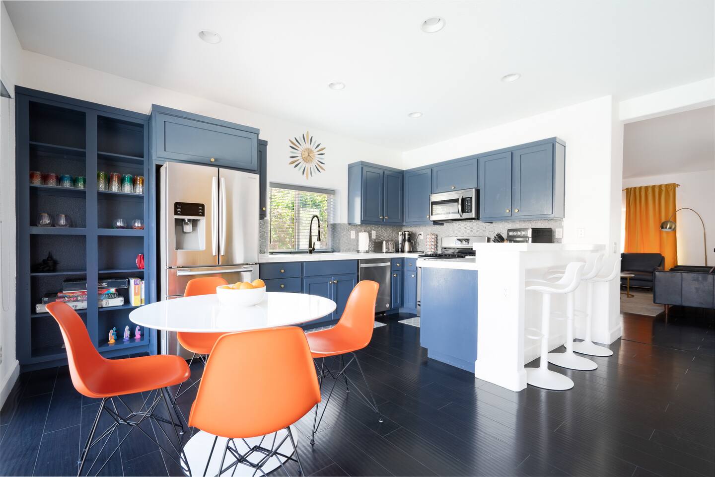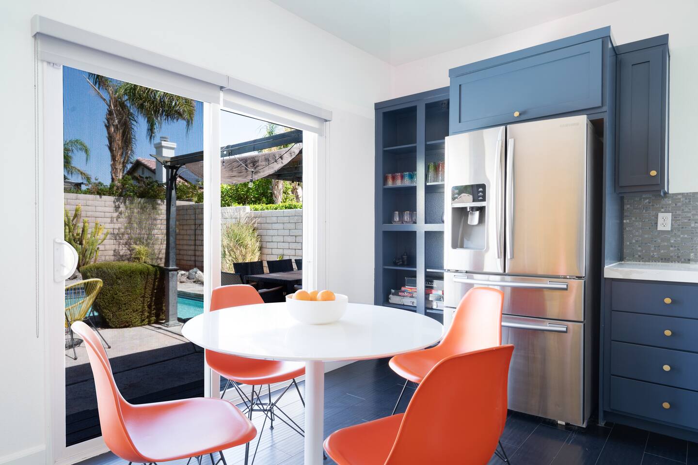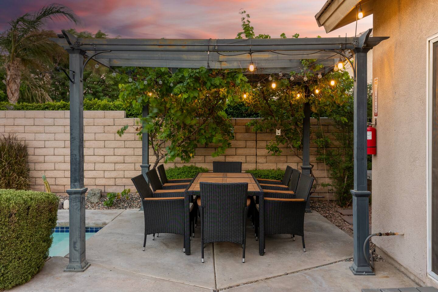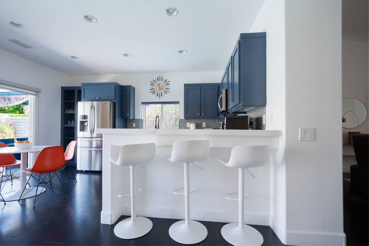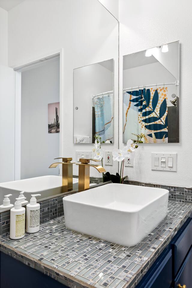 This is 4BD, 2BA home is ready for your group! Your group will enjoy the open layout of a spacious living room w/ gas fireplace and large Smart TV above. Also available is a dedicated desk with a monitor, this space is perfect for those needing to WFH. Our dining room table has seating for 8 and a bar cart nearby to mix cocktails/mocktails for your group. There is additional kitchen bar seating with 3 stools and a round mid century tulip breakfast table that seats 4. All seating overlooks the beautiful backyard pool. The Kitchen is fully stocked with all the tools and appliances you will need to prepare meals. Lastly, Head out back to the spacious and private backyard where you'll find your sparkling pool and hot tub. There are lounge chairs and two seperate seating areas with outdoor couches and fire pit(propane)or the outdoor table with string lighting that seats 8. Our gas BBQ is located on the side of the house. Our garage fits 2 vehicles and up to 4 in the driveway. This is a great home whether you're hosting a family outing, bachelorette party, or just a get-together with some close friends.