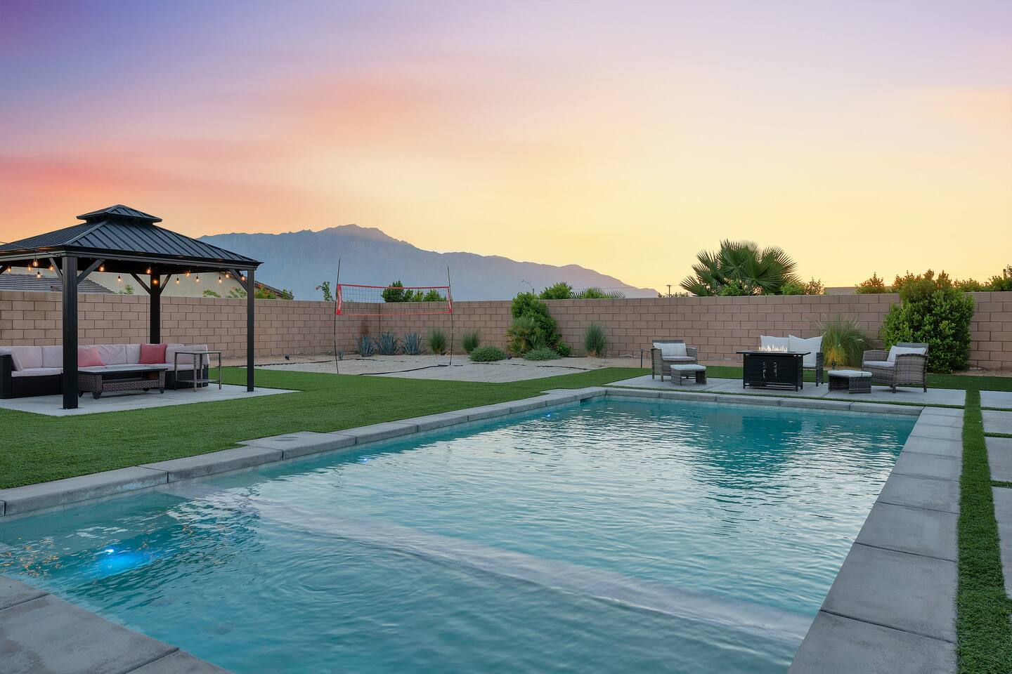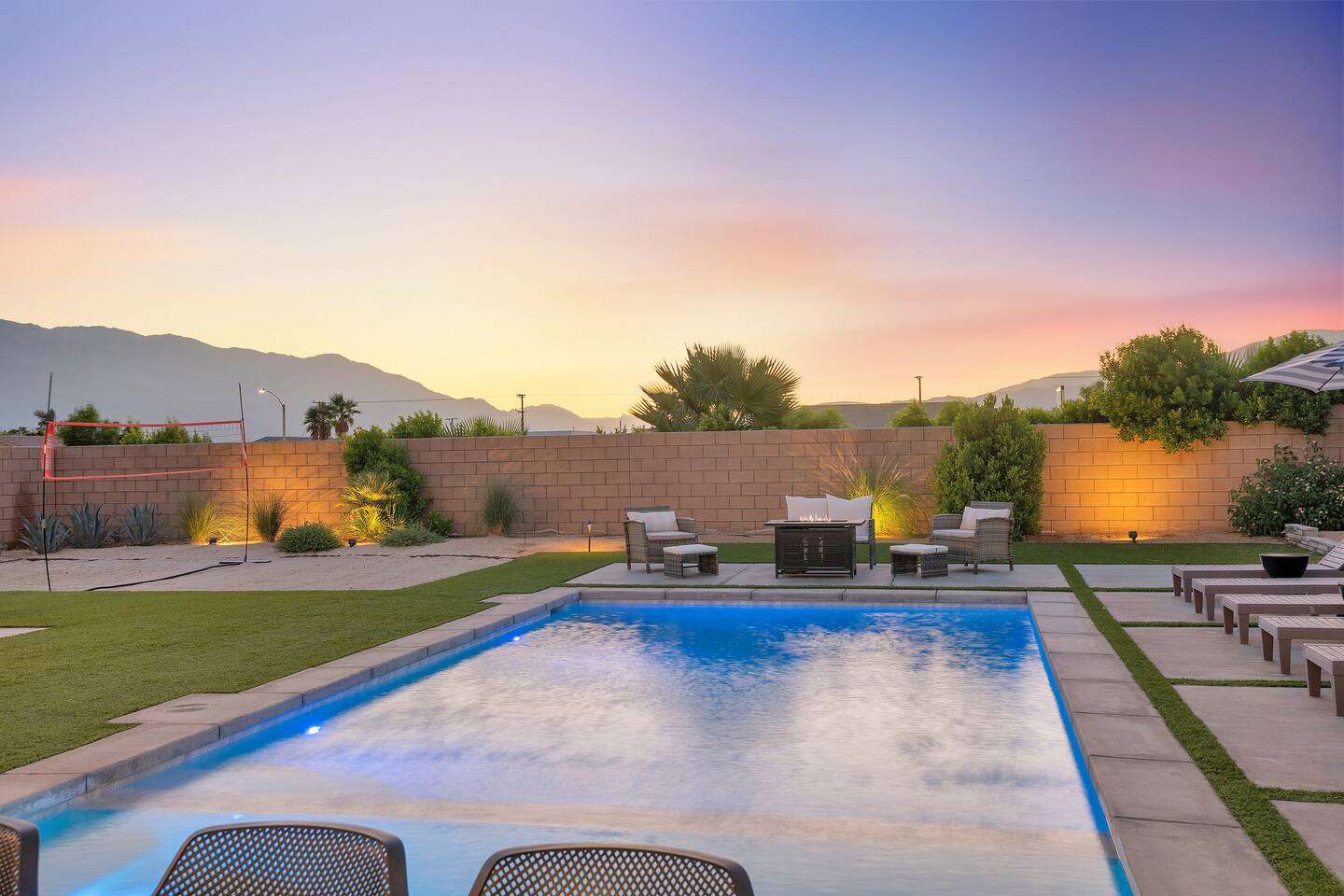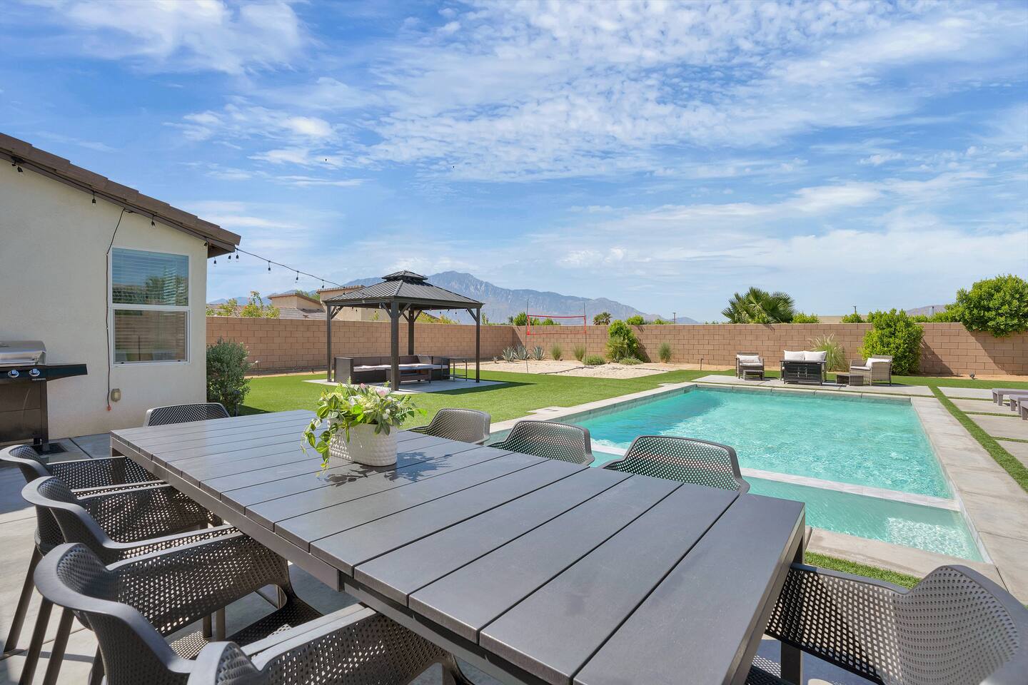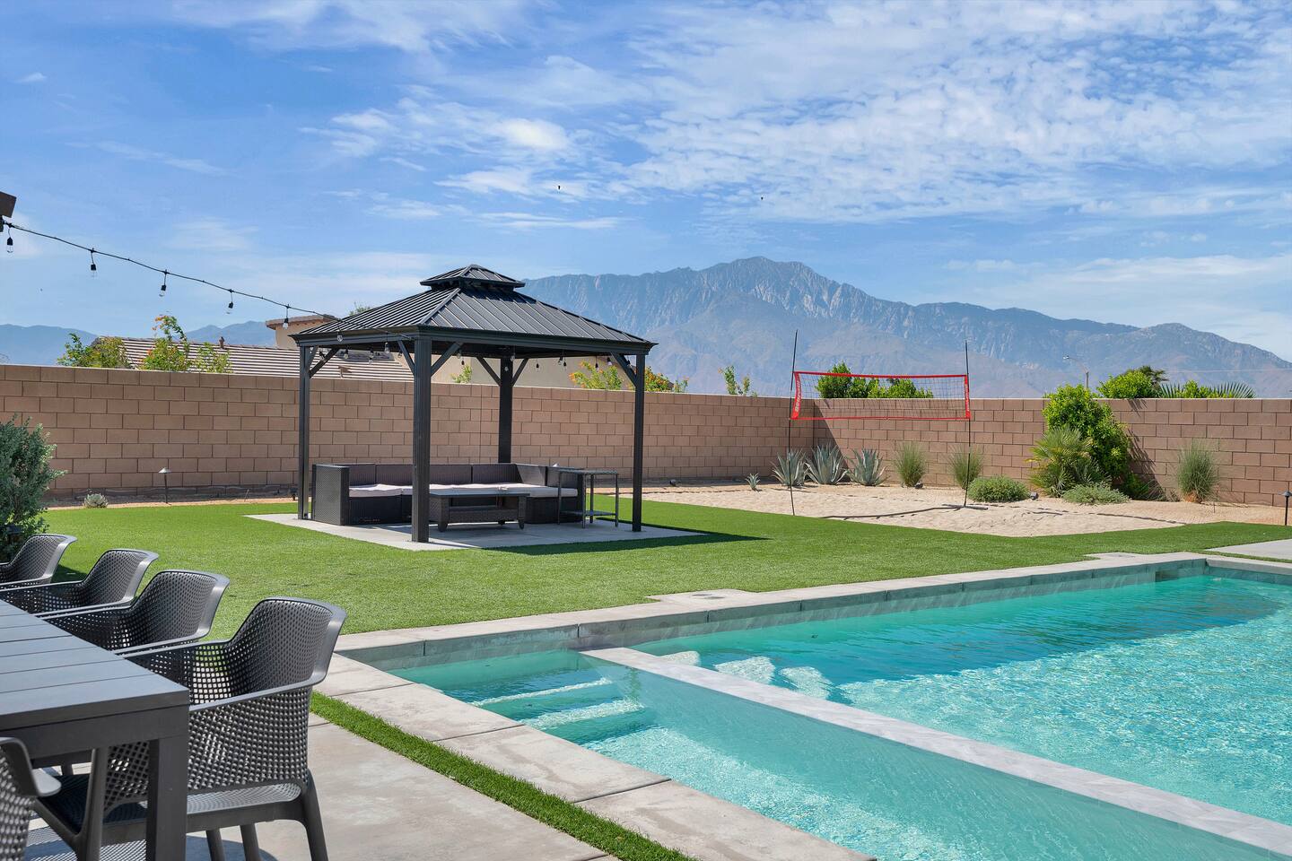 Enjoy a fun, desert living experience at this centrally located gorgeous home. Conveniently located a short 15 min drive from Palm Springs (PSP) airport and downtown Palm Springs. This brand new construction, 3 bdr home is the perfect spot to come enjoy your next vacation. Tastefully decorated, new comfortable furniture, the huge backyard with expansive pool/8 person spa and sand Volleyball court will be sure to keep you & your guests entertained!