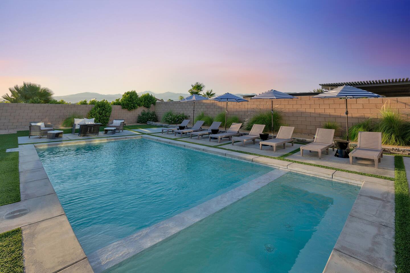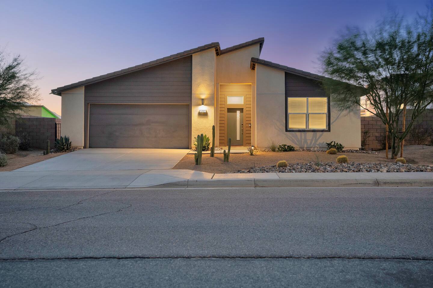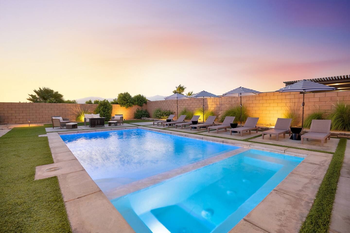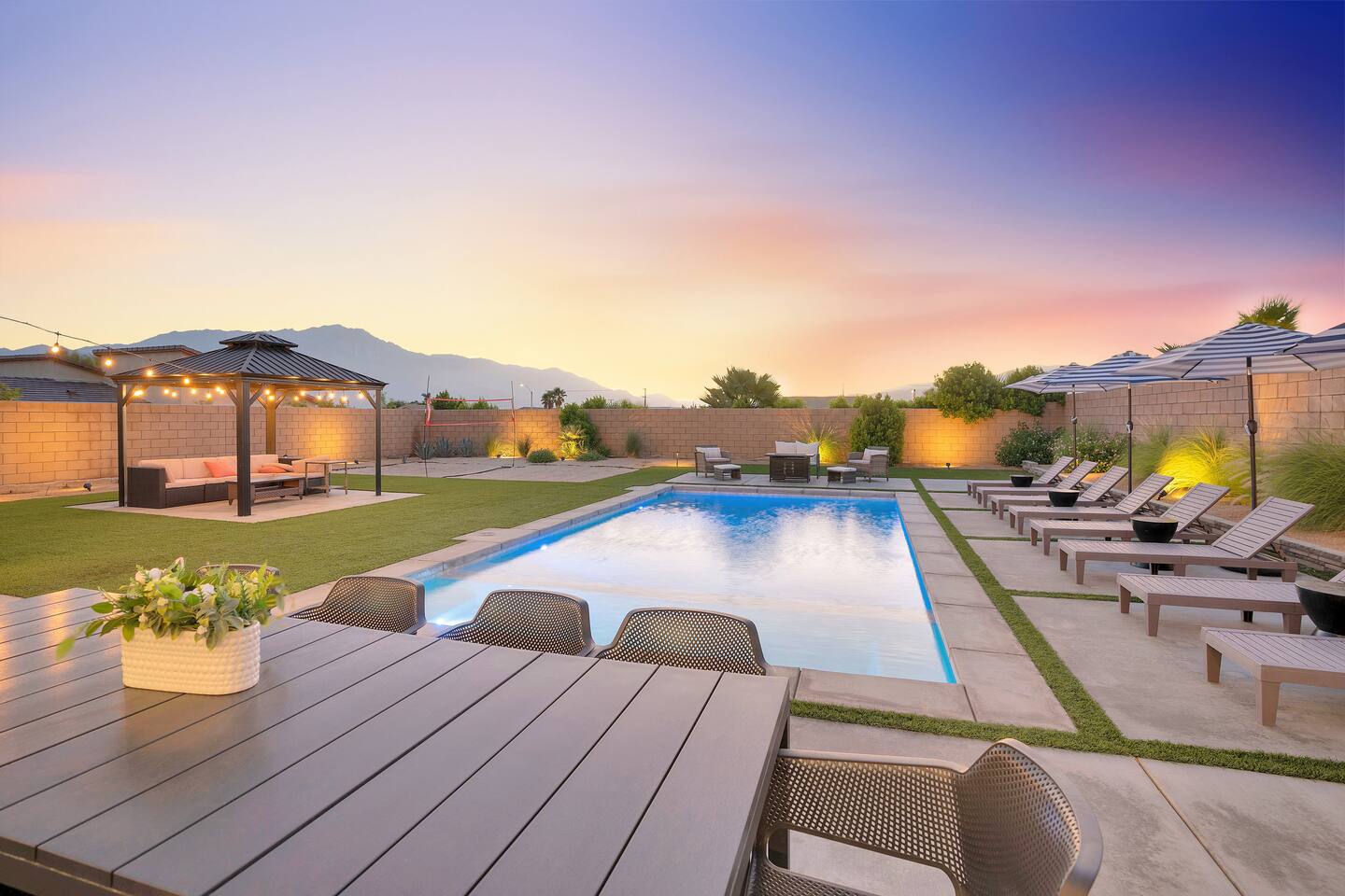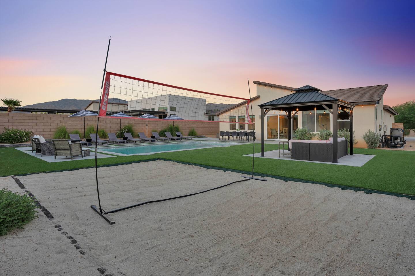 Enjoy a fun, desert living experience at this centrally located gorgeous home. Conveniently located a short 15 min drive from Palm Springs (PSP) airport and downtown Palm Springs. This brand new construction, 3 bdr home is the perfect spot to come enjoy your next vacation. Tastefully decorated, new comfortable furniture, the huge backyard with expansive pool/8 person spa and sand Volleyball court will be sure to keep you & your guests entertained!