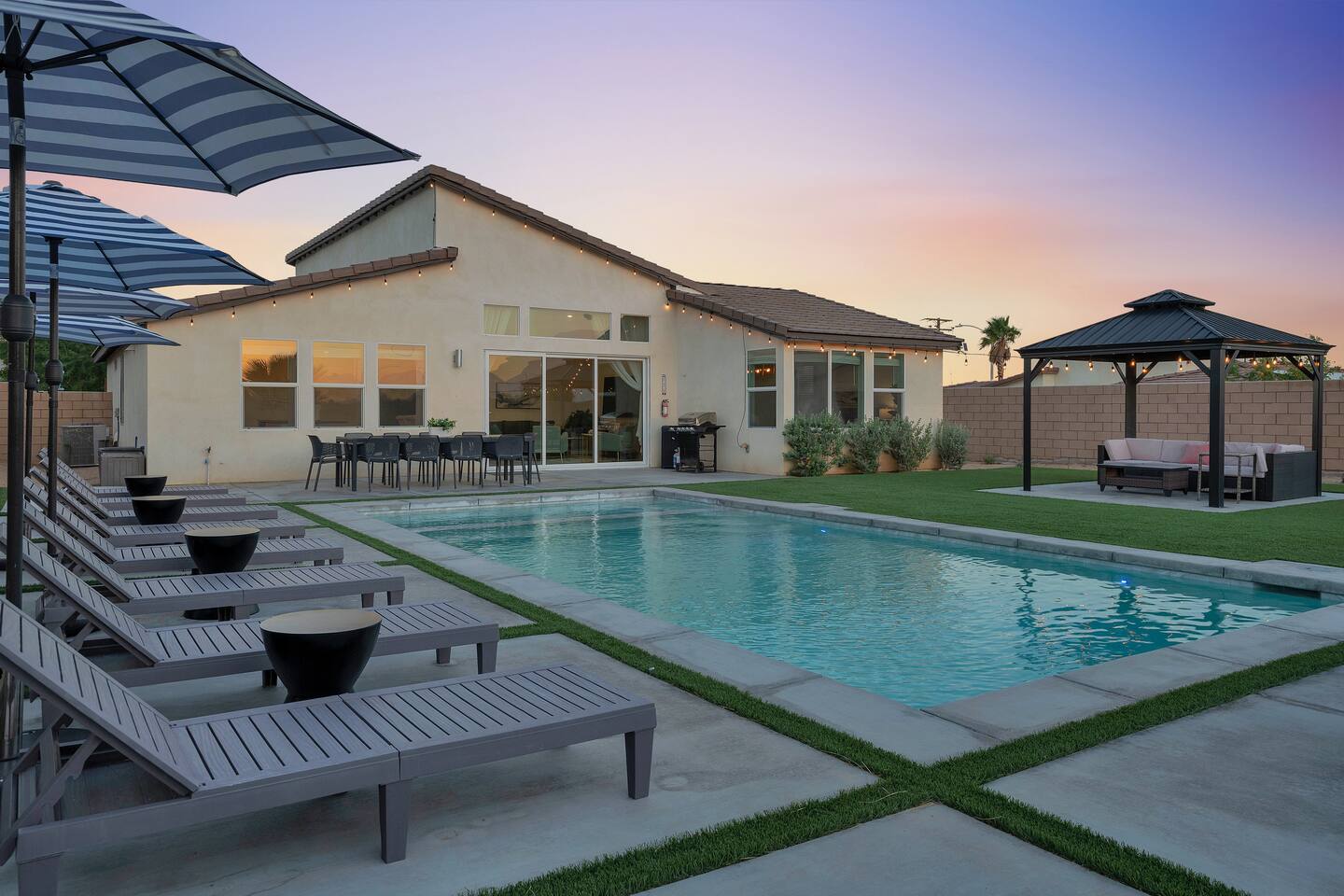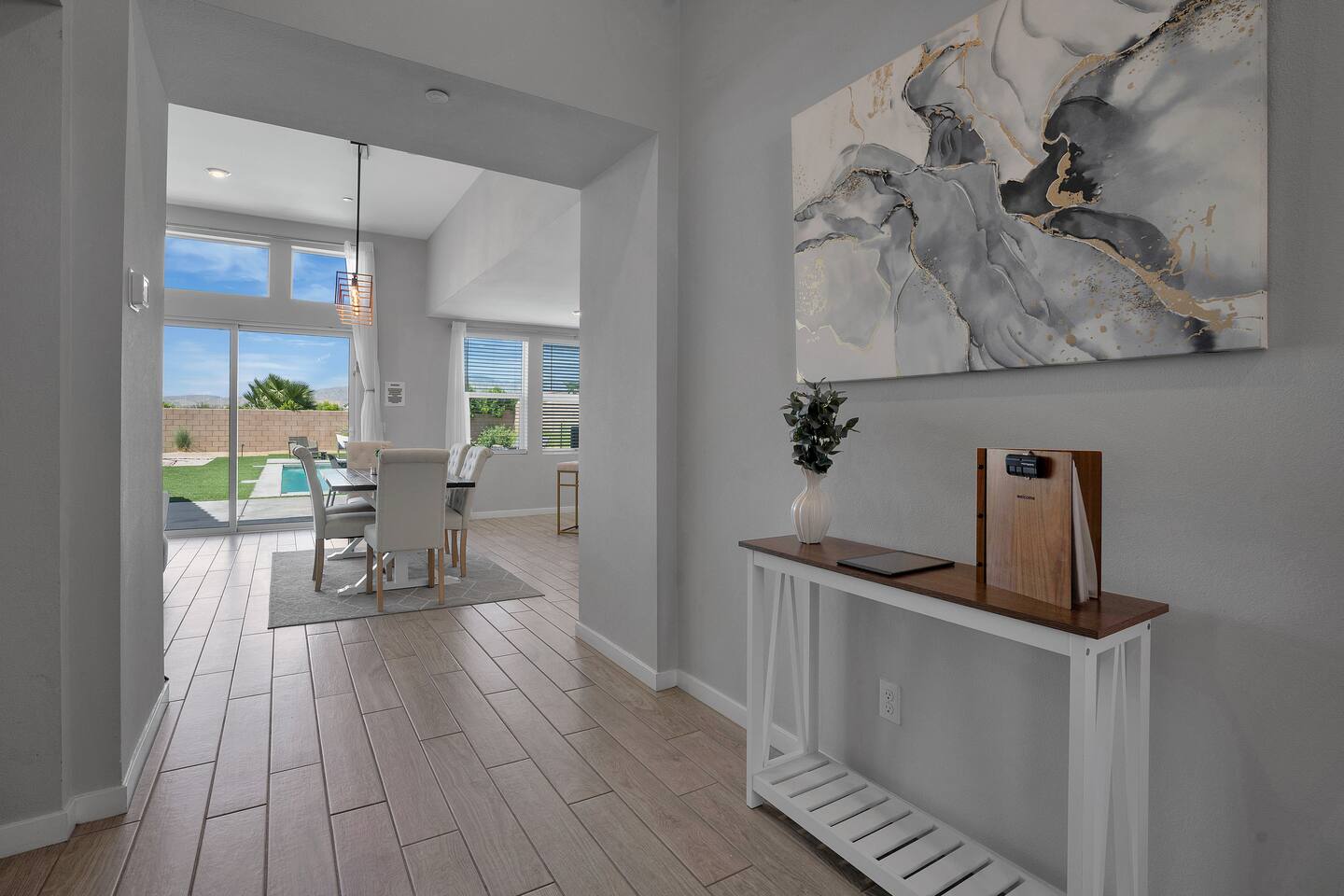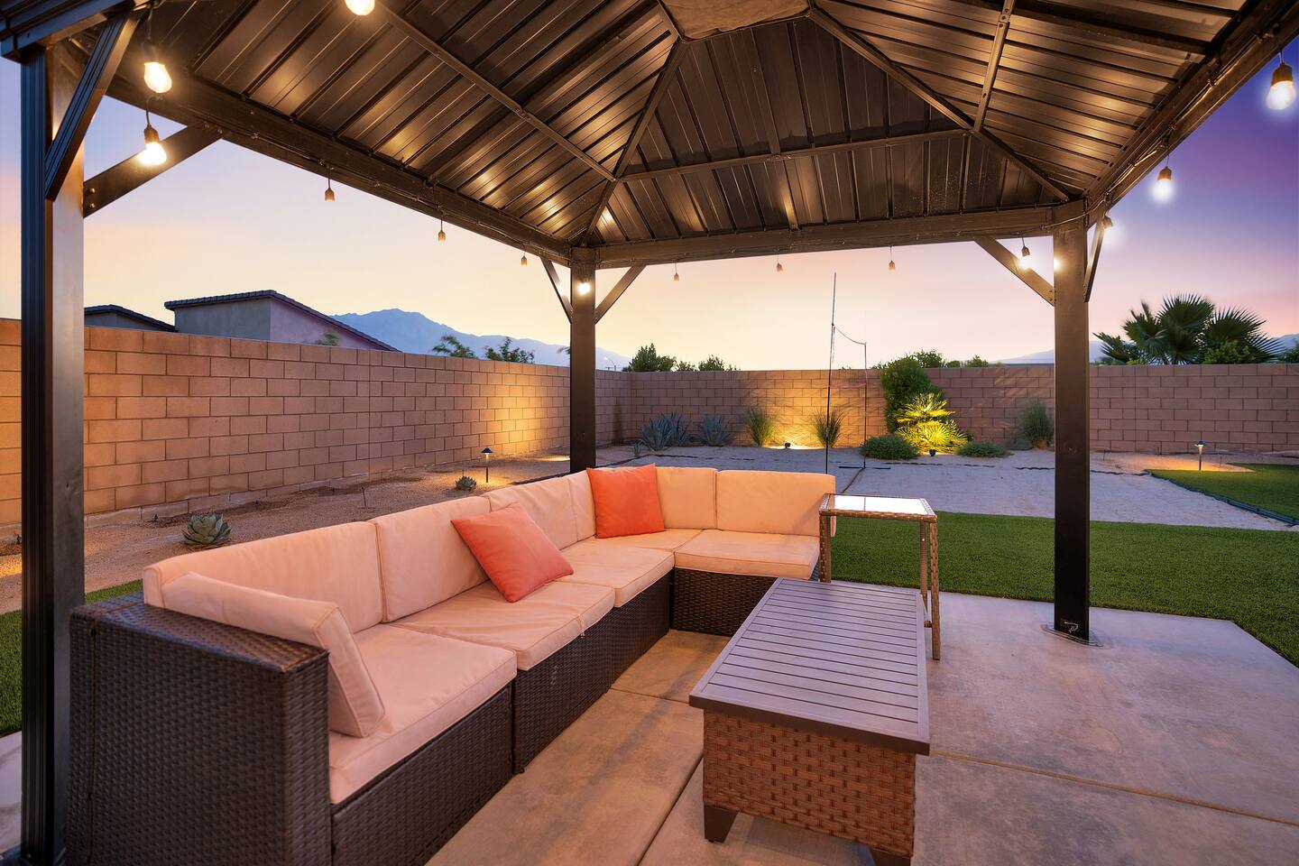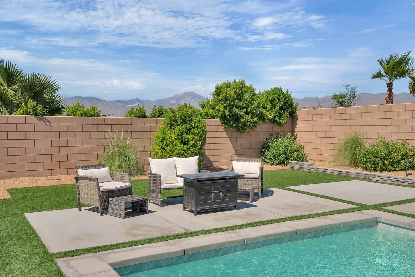 Enjoy a fun, desert living experience at this centrally located gorgeous home. Conveniently located a short 15 min drive from Palm Springs (PSP) airport and downtown Palm Springs. This brand new construction, 3 bdr home is the perfect spot to come enjoy your next vacation. Tastefully decorated, new comfortable furniture, the huge backyard with expansive pool/8 person spa and sand Volleyball court will be sure to keep you & your guests entertained!